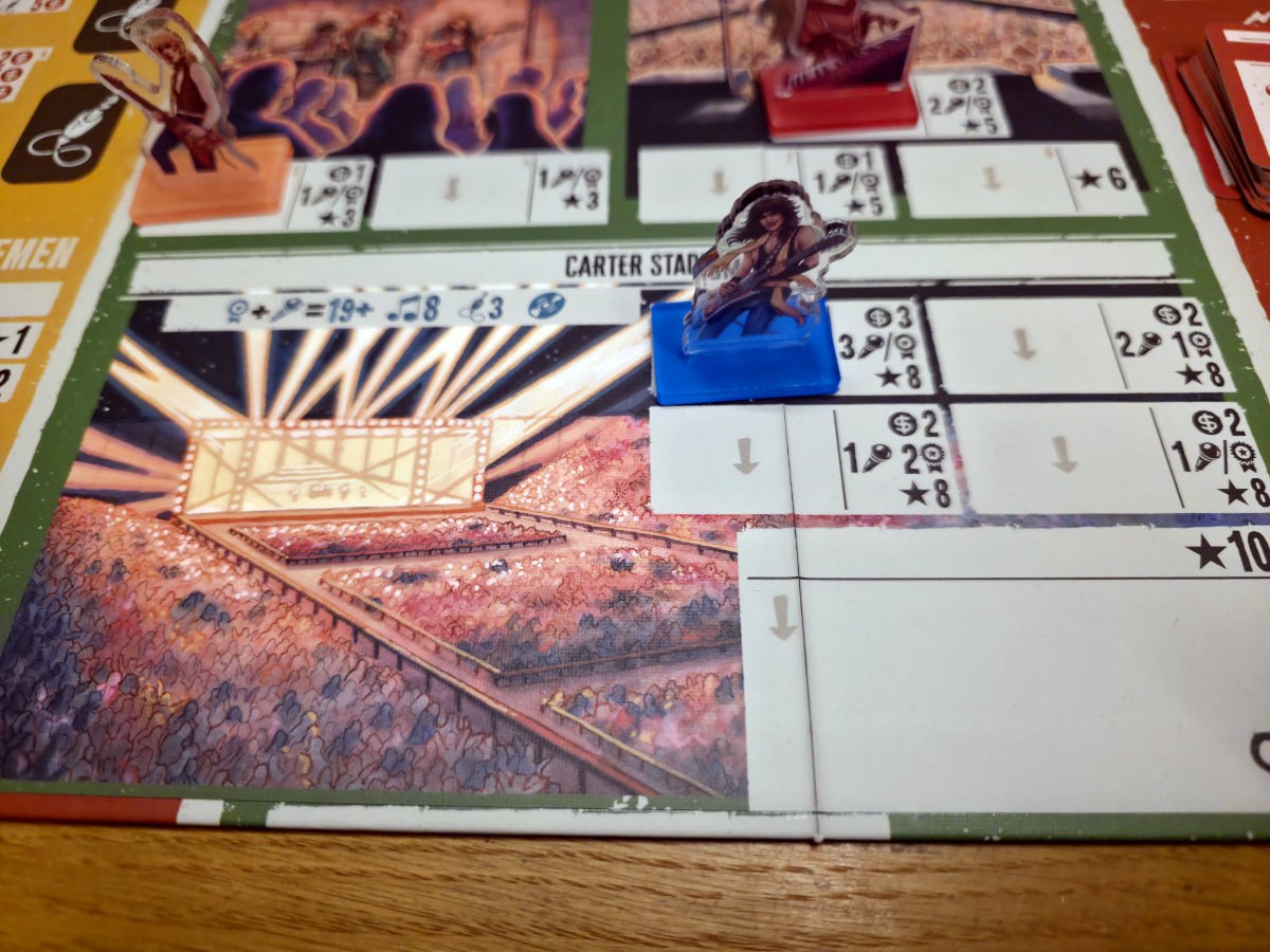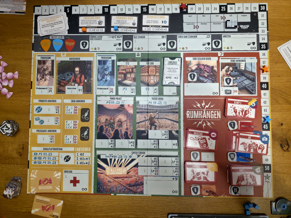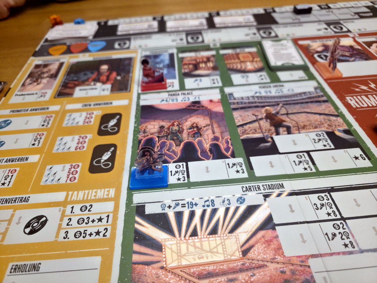 Das Spielbrett ist in Tageszeiten gegliedert, die als Workerplacement-Felder dienen. Morgens kümmert man sich um Promotion, Jobs oder Managerkontakte, abends stehen Konzerte an, und nachts kann man sich in Clubs herumtreiben, Songs schreiben oder Ruhm sammeln.