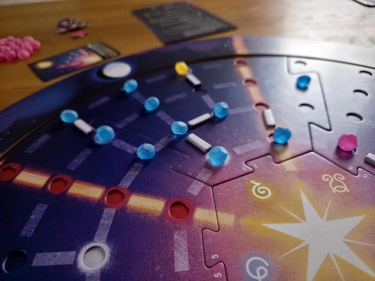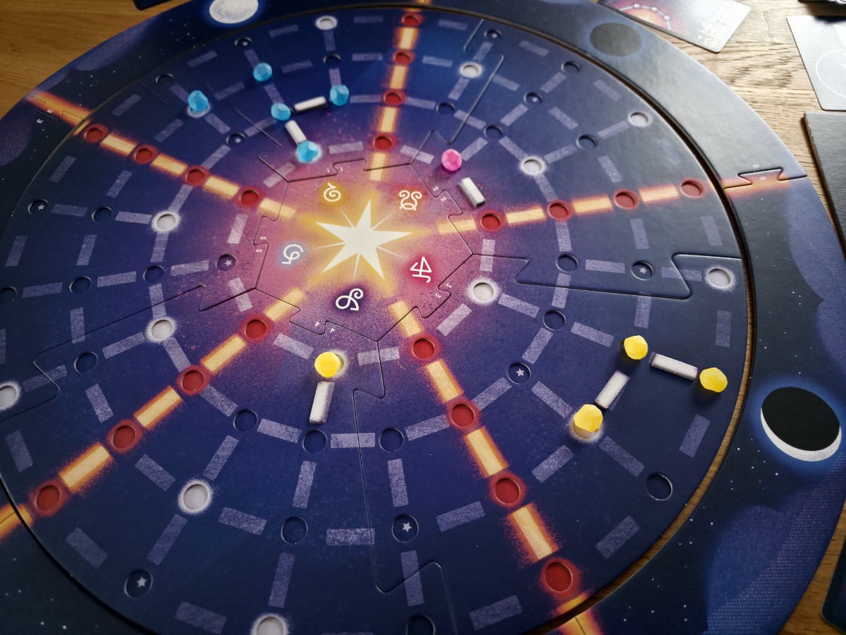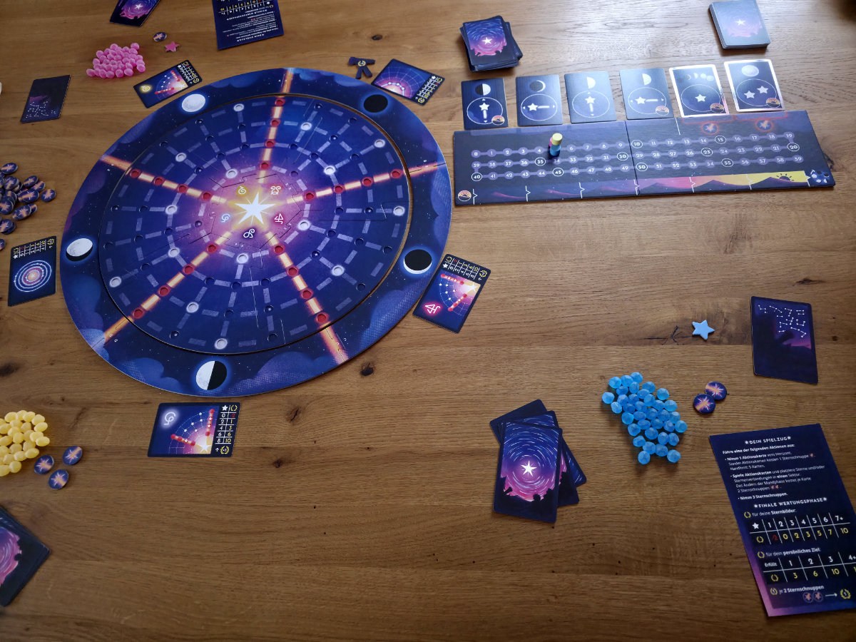 Der Aufbau ist schnell erledigt, aber thematisch erstaunlich dicht. Die Sternschnuppen als Ressource, das Teleskop als Marker für die nächste Wertung, die Umlaufbahnen, die Sektoren, die roten Randfelder – alles greift ineinander, ohne überladen zu wirken.