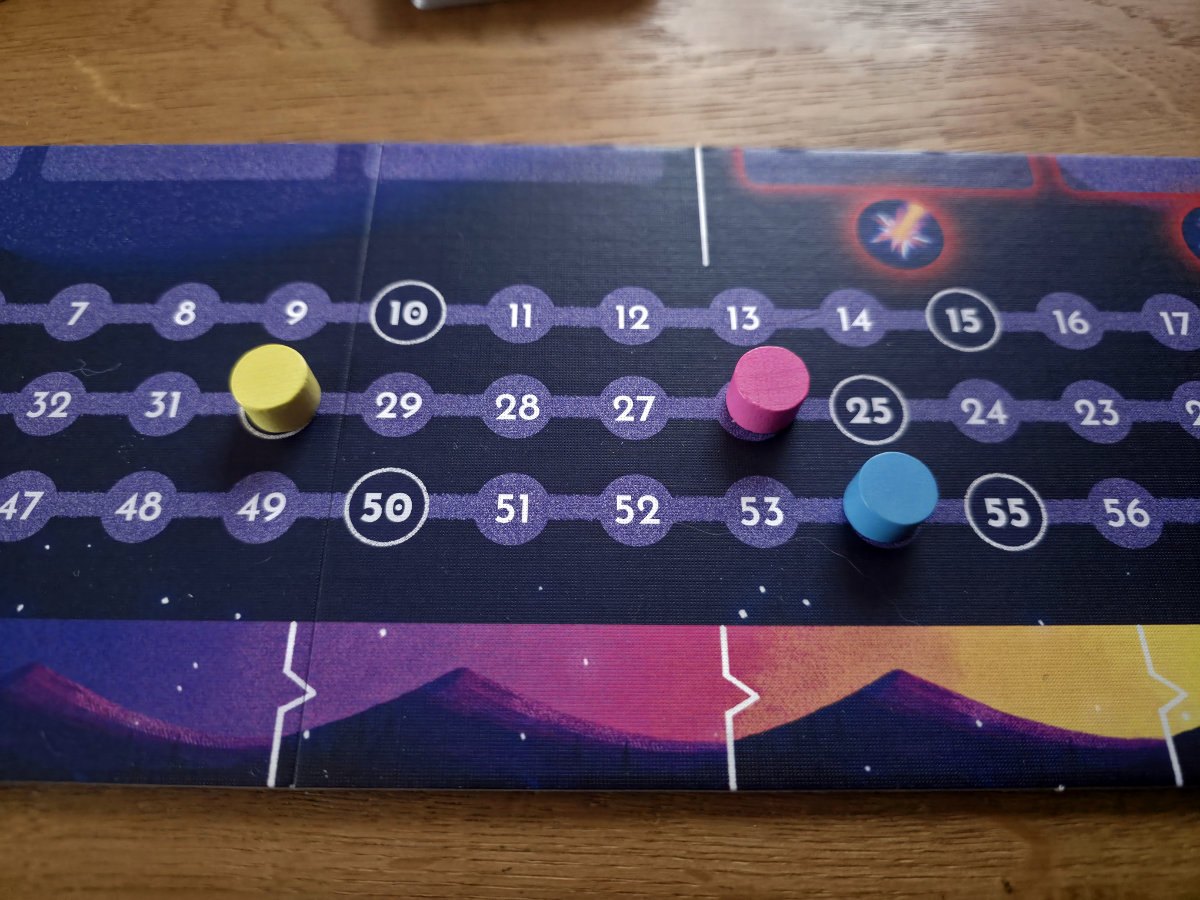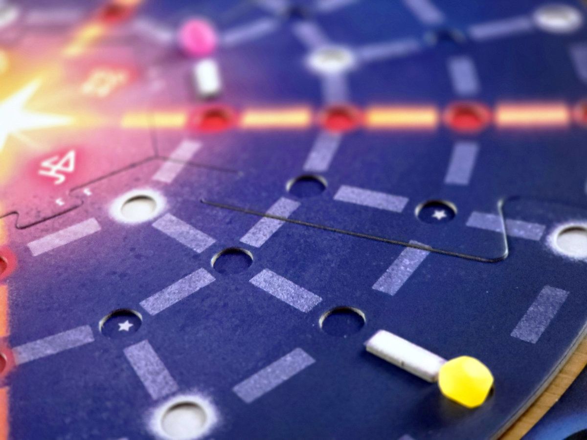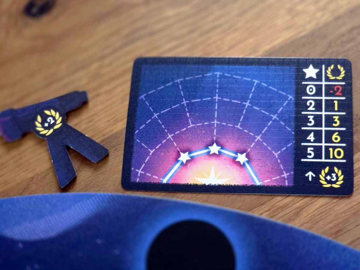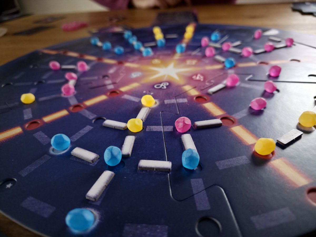 Der Aufbau ist schnell erledigt, aber thematisch erstaunlich dicht. Die Sternschnuppen als Ressource, das Teleskop als Marker für die nächste Wertung, die Umlaufbahnen, die Sektoren, die roten Randfelder – alles greift ineinander, ohne überladen zu wirken.