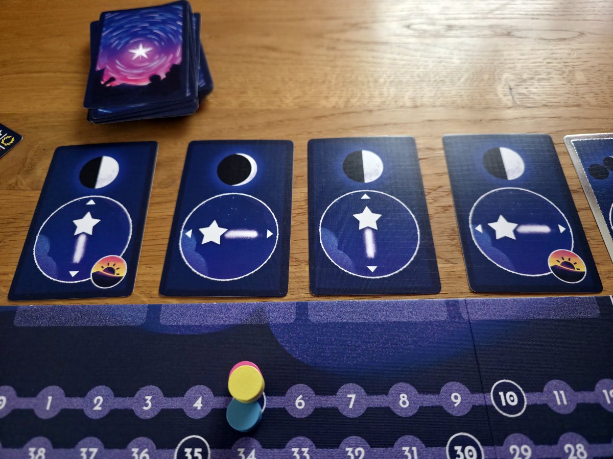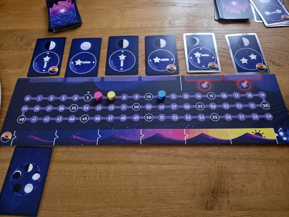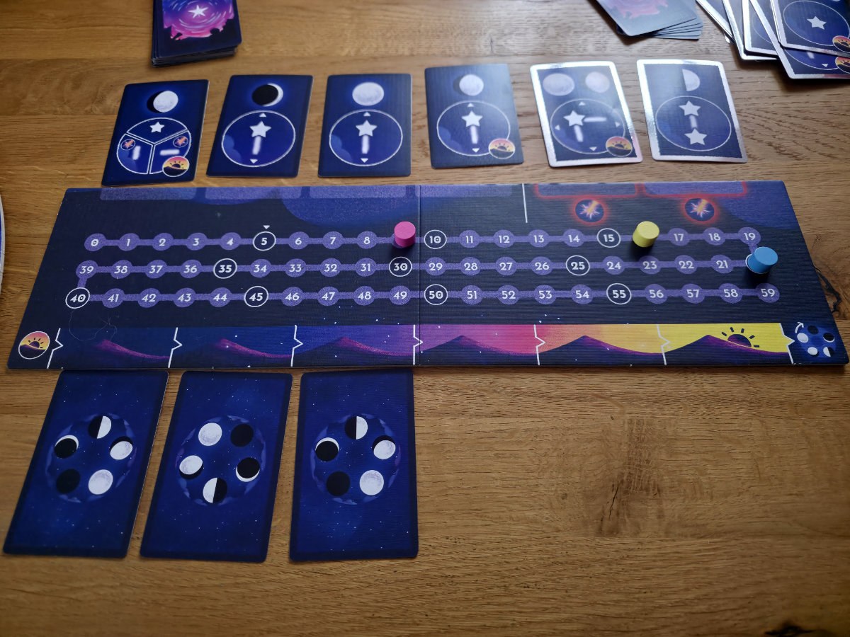 Das Besondere ist, dass man beliebig viele Karten spielen darf, solange sie dieselbe Mondphase zeigen. Wer mehr Flexibilität braucht, kann die Mondphase einer Karte ändern – bezahlt aber mit Sternschnuppen. Dieser Mechanismus ist elegant, weil er taktische Freiheit ermöglicht, aber gleichzeitig Ressourcenmanagement erzwingt.