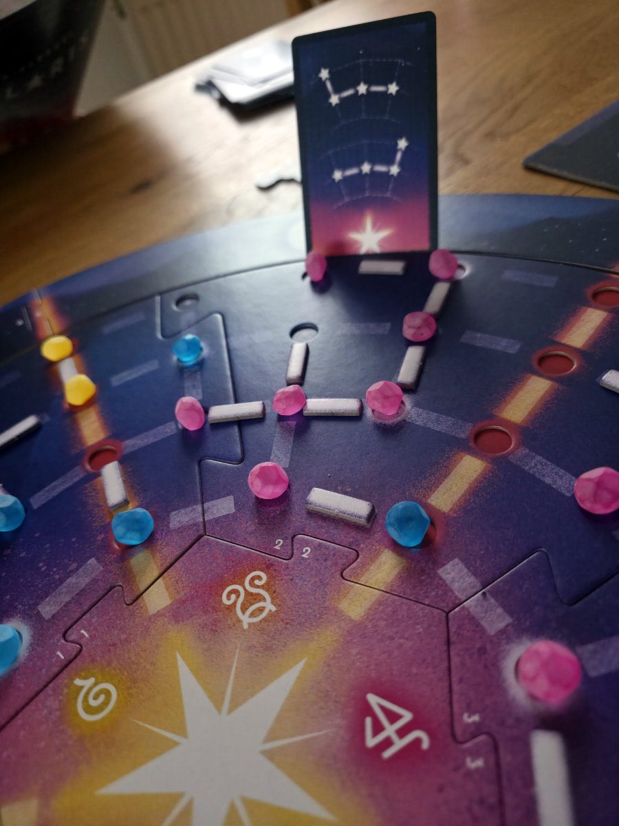 Die Platzierung selbst ist intuitiv, aber voller kleiner Entscheidungen. Weiße Felder bringen Sternschnuppen, rote Felder kosten welche. Verbindungen müssen der Ausrichtung der Karte folgen. Und Polaris, der zentrale Stern, kann Sternbilder verbinden, zählt aber nicht für persönliche Ziele. Das erzeugt ein ständiges Abwägen zwischen kurzfristiger Effizienz und langfristigem Aufbau.