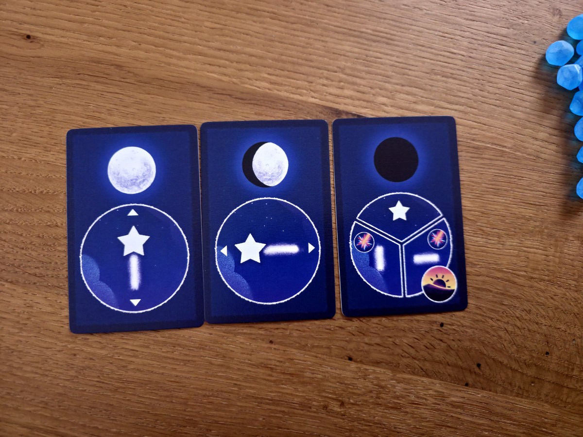 Die Aktionskarten sind das eigentliche Steuerpult des Spiels. Jede zeigt eine Mondphase, die den erlaubten Sektor vorgibt, Elemente, die man platzieren darf (Sterne, horizontale oder vertikale Verbindungen) und gelegentlich ein Morgensymbol, das die Karte unter den Horizont wandern lässt und damit die Wertungsphase vorantreibt.
