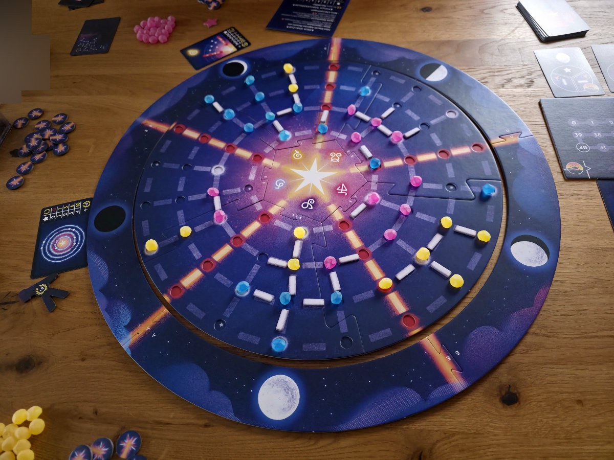 Der modulare Nachthimmel, zusammengesetzt aus fünf Sektoren, wirkt zunächst wie ein abstraktes Raster. Doch sobald die Mondphasen um ihn herum platziert werden, entsteht ein dynamisches System. Die Mondposition bestimmt, welche Aktionskarten in welchem Sektor gespielt werden dürfen und welches Ziel am Ende einer Wertungsphase zählt. Dadurch fühlt sich jede Partie wie ein rotierendes kosmisches Uhrwerk an, das man nicht kontrolliert, sondern antizipiert.