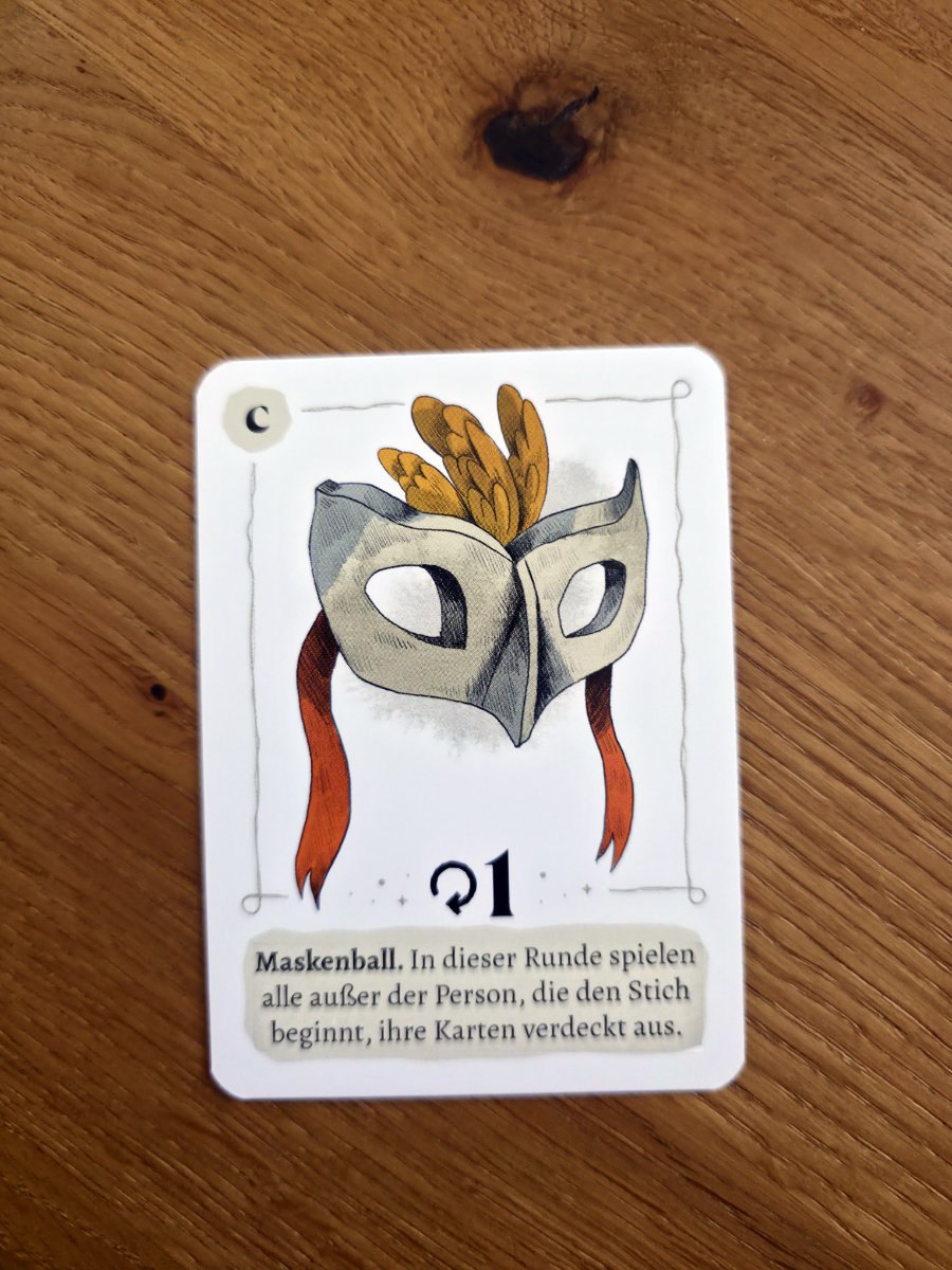 Mechanisch funktioniert „RP“ quasi wie ein Stichspiel. Jede Runde wird von den Spielern eine Karte ausgespielt, die Werte von 1 bis 12 tragen kann. Neben den Prinzessinnenkarten gibt es auch Tierkarten, darunter den berüchtigten Froschkönig, der bringt gleich 5 Heiratsanträge auf einen Schlag mit^^. Wer den Stich beginnt, legt eine Karte offen aus, die anderen folgen – doch es gibt Varianten wie den „Maskenball“, bei dem verdeckt gespielt wird. Die Spannung entsteht aus der Mischung von klassischen Stichspiel-Elementen und den besonderen Effekten der Runden-Karten, die das Geschehen immer wieder auf den Kopf stellen mit ihren Ablauf- und Regelverändernden Vorgaben. Wer den Stich gewinnt (höchste Karte in der zuerst ausgespielte Farbe), erhält alle beteiligten Karten und so eventuell eben auch Prinz-Karten und damit ungewollte Heiratsanträge^^. Wer am Ende die wenigsten Anträge erhalten hat, gewinnt.