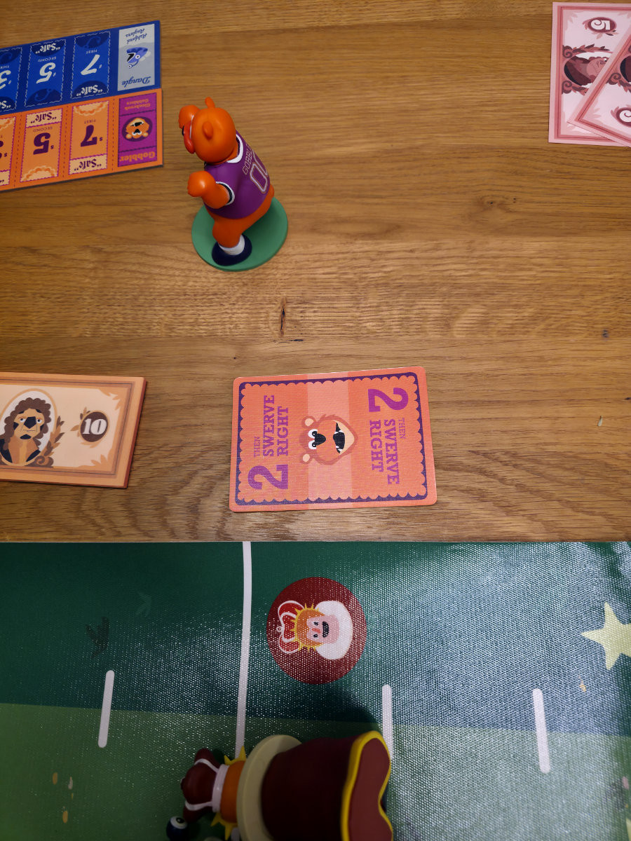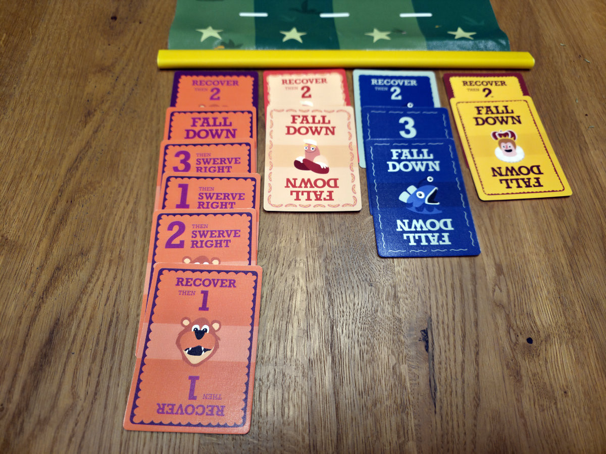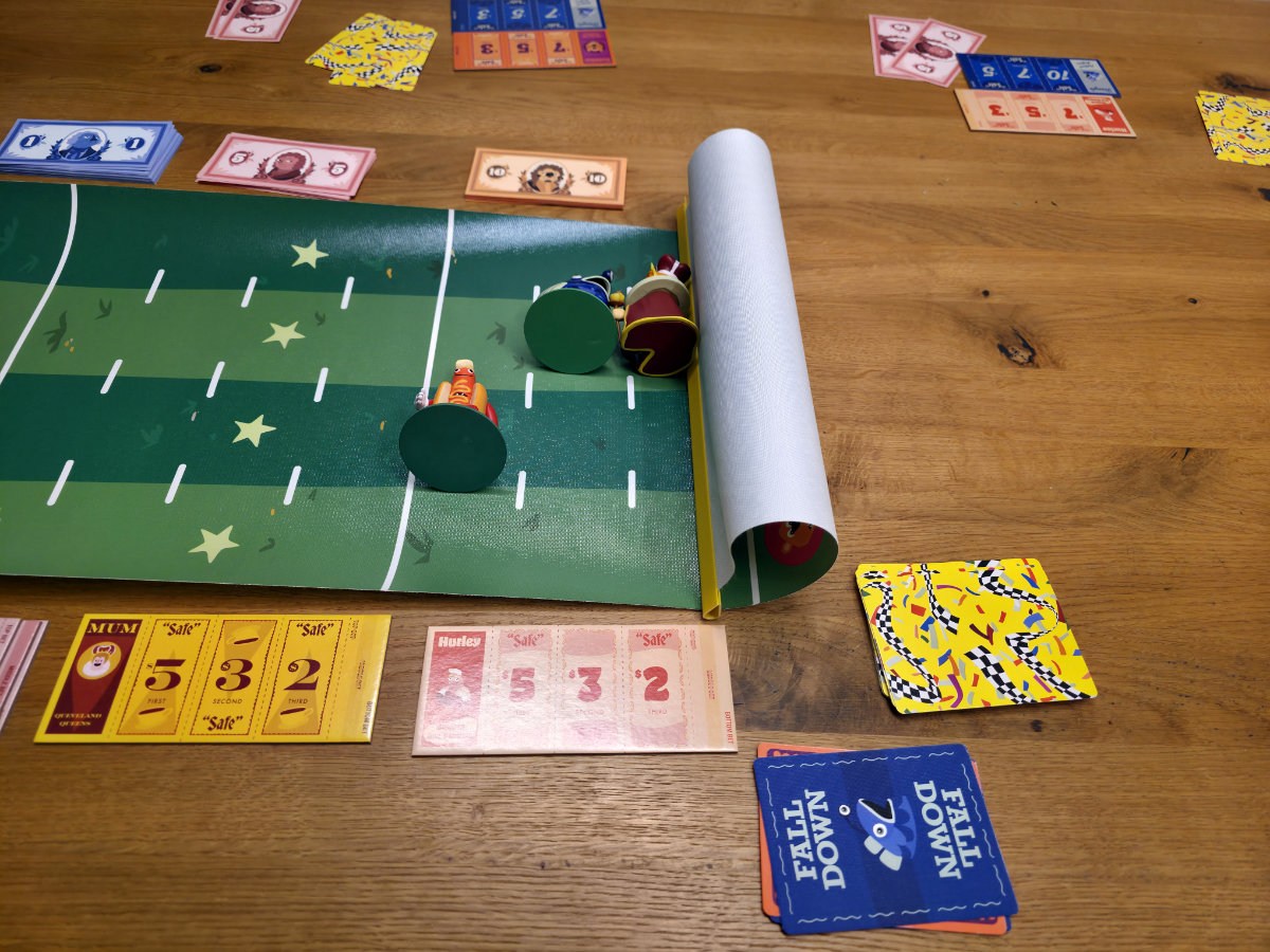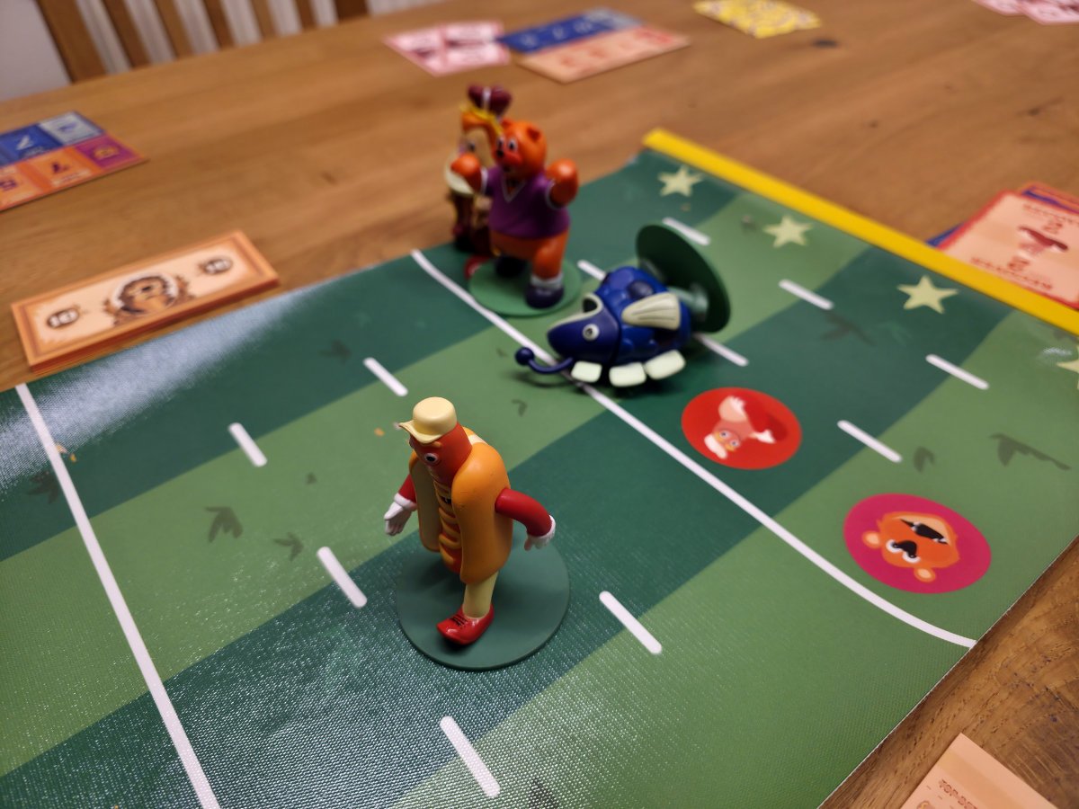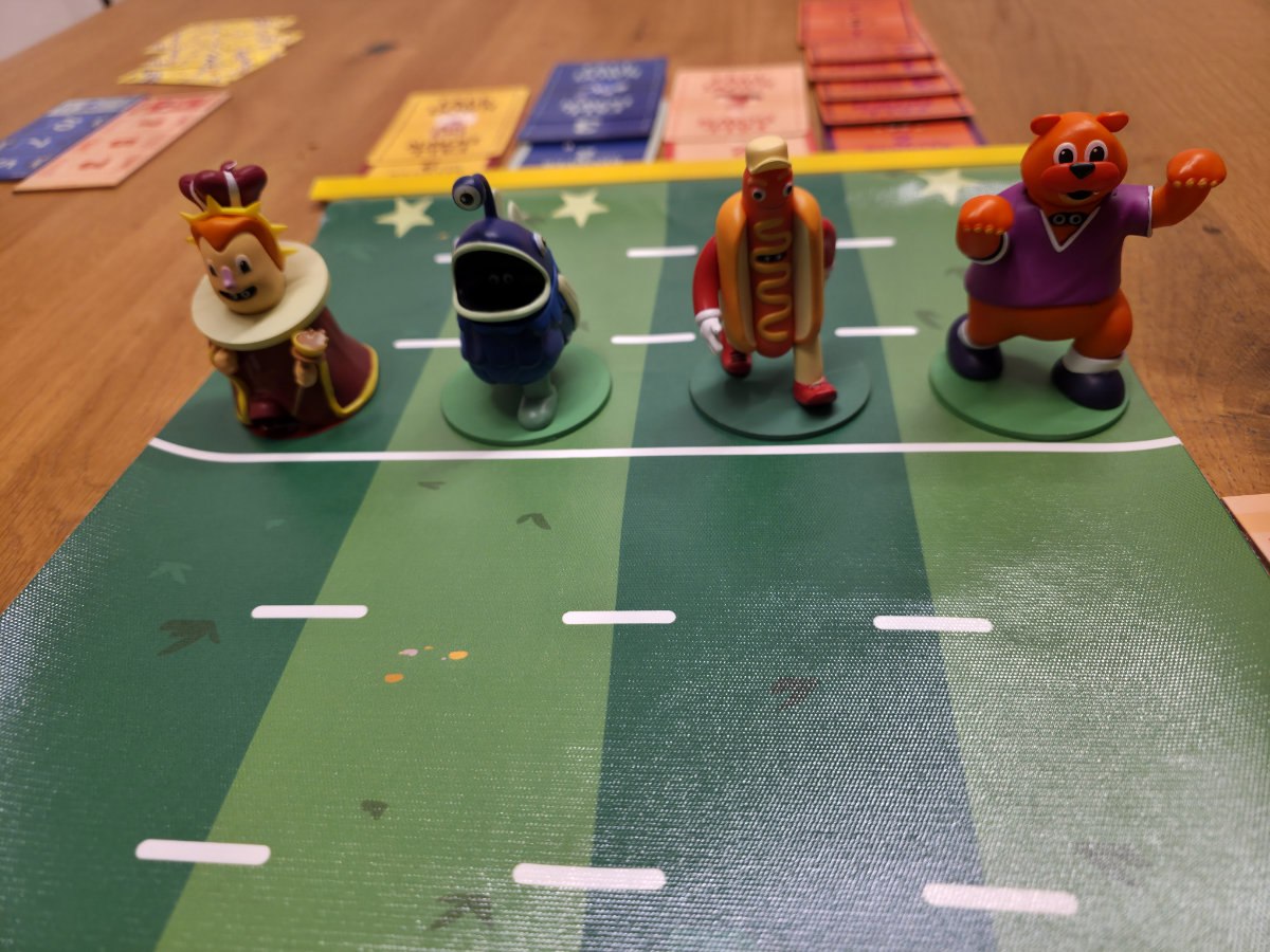 Der Clou ist, dass alle Entscheidungen vor dem Rennen fallen. Die Wetten werden platziert und man legt so fest, auf welches Maskottchen man (hoffnungsvoll^^) setzt und dann heißt es zurücklehnen, johlen, buhen und hoffen, dass der Favorit nicht stolpert. Anders als bei klassischen Rennspielen gibt es während des Laufs keine wirklichen Eingriffe – die Figuren bewegen sich automatisch, und man kann nur noch zuschauen, wie sich das Chaos entfaltet. Denn vor Rennbeginn wurde ein Kartensatz für alle Maskottchen zufällig erstellt – plus eine Kartenzugabe von den Spielern, die damit geheim ihrem vermeintlichen Favoriten Vorteile zu verschaffen hoffen – und von diesem werden nun Karte für Karte die Aktionen aufgedeckt, die die Rennprobanden ausführen müssen. Da gibt es ein Vorwärtsmarschieren, genauso wie ein Stolpern (wer dann nochmal „stolpert“ scheidet aus) oder ein plötzliches Umdrehen und Laufen in die andere Richtung. Manchmal kann es sein, dass ein Läufer die Bahn wechselt und dabei einen anderen umstößt, oder aber durch ein solch seitliches Gehen verlässt jemand die Rennbahn komplett – und scheidet damit aus. Es kann alles mögliche passieren und das macht die hektische Freude aus^^.