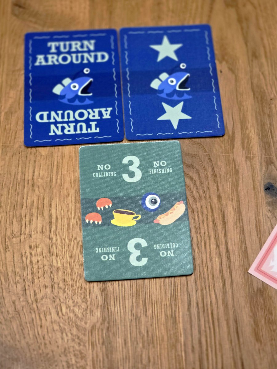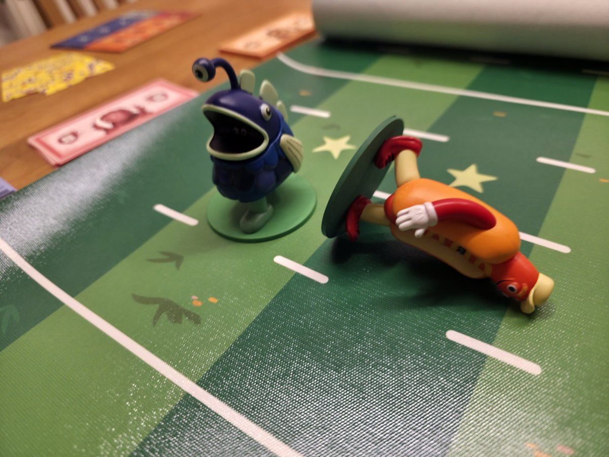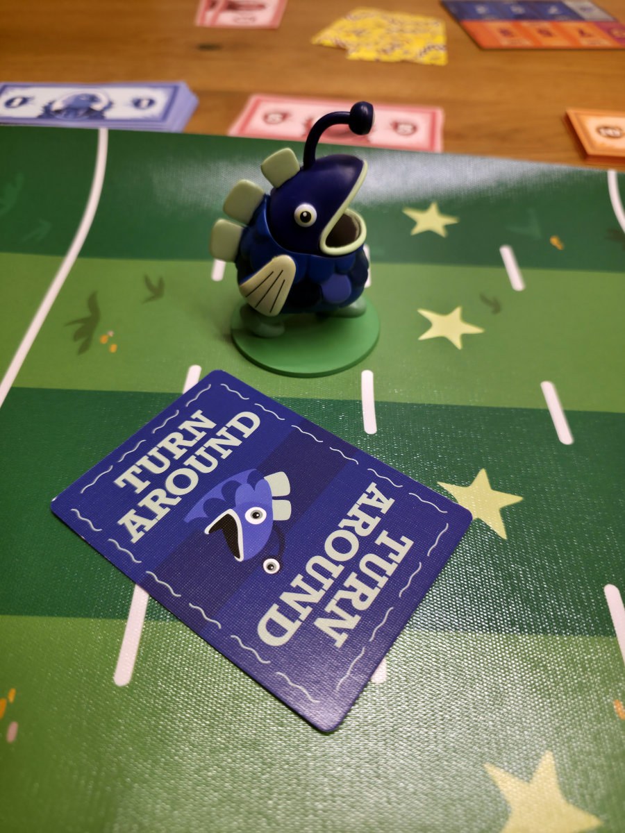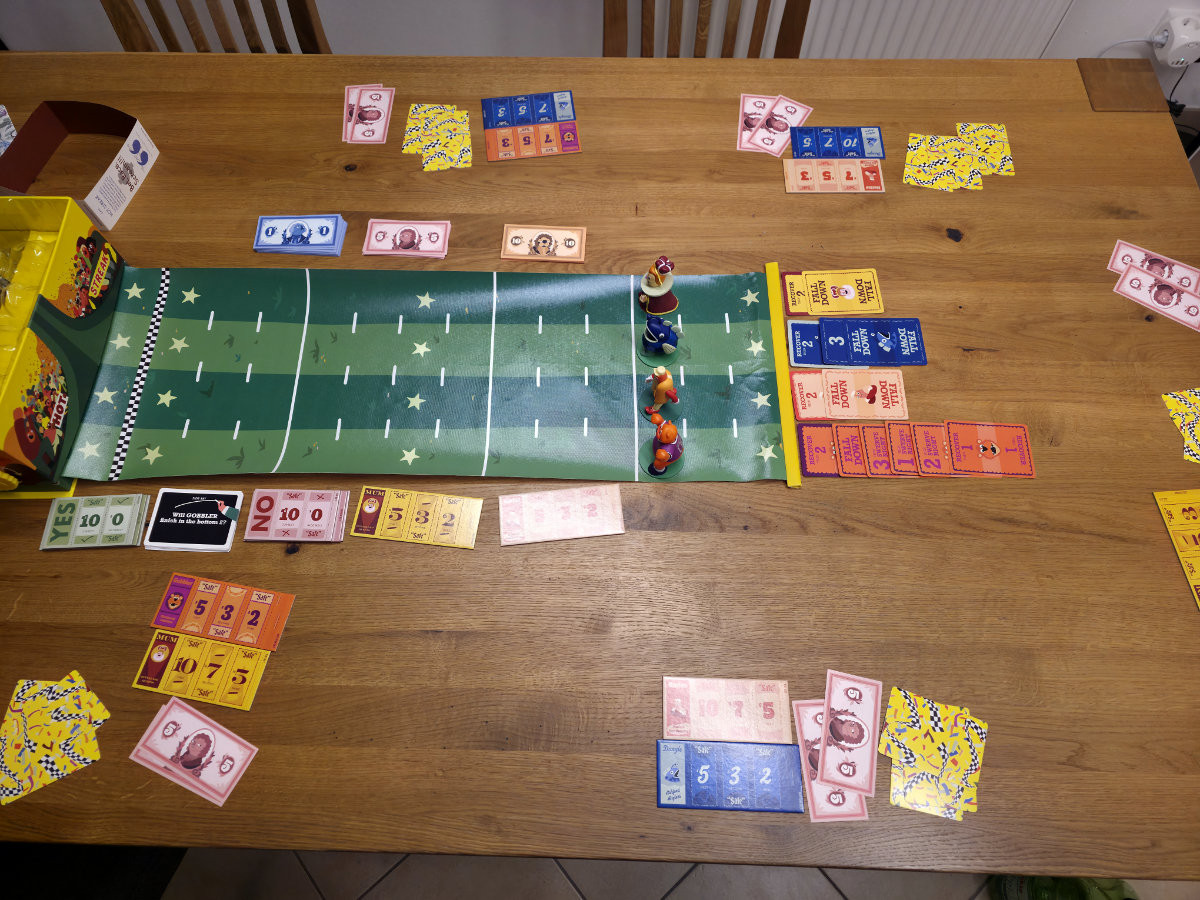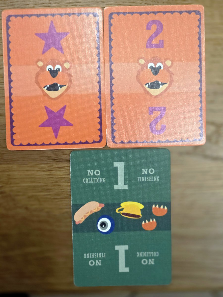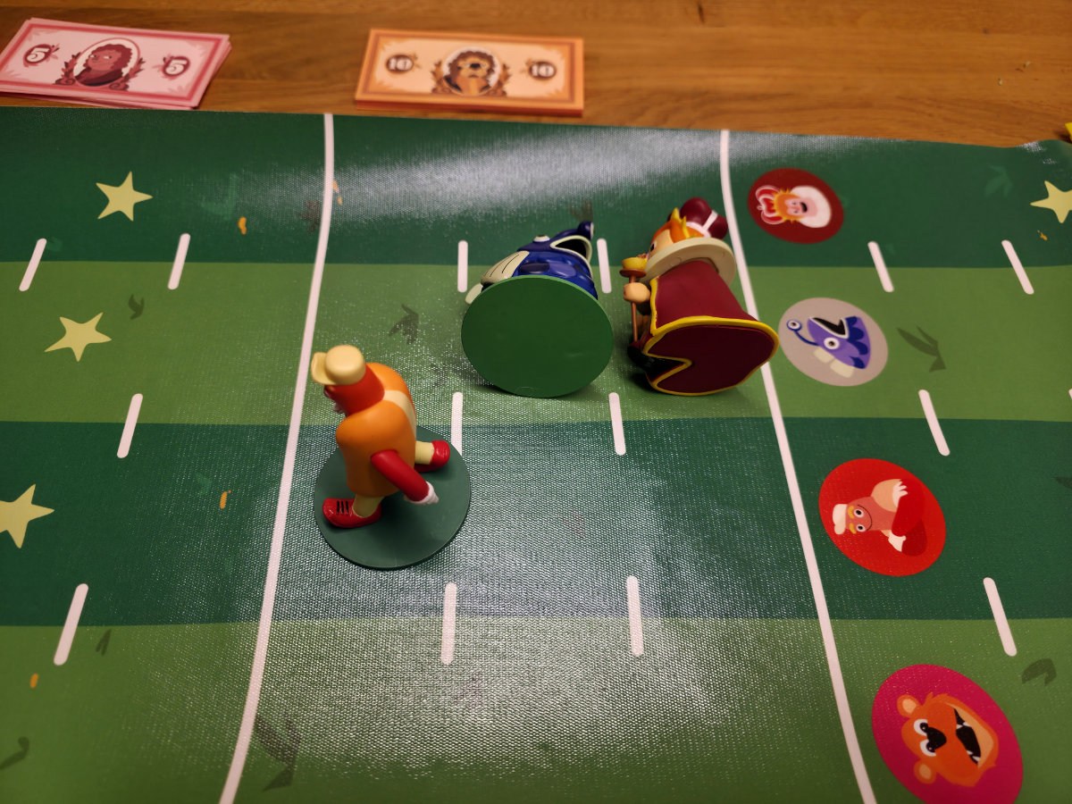 Der Clou ist, dass alle Entscheidungen vor dem Rennen fallen. Die Wetten werden platziert und man legt so fest, auf welches Maskottchen man (hoffnungsvoll^^) setzt und dann heißt es zurücklehnen, johlen, buhen und hoffen, dass der Favorit nicht stolpert. Anders als bei klassischen Rennspielen gibt es während des Laufs keine wirklichen Eingriffe – die Figuren bewegen sich automatisch, und man kann nur noch zuschauen, wie sich das Chaos entfaltet. Denn vor Rennbeginn wurde ein Kartensatz für alle Maskottchen zufällig erstellt – plus eine Kartenzugabe von den Spielern, die damit geheim ihrem vermeintlichen Favoriten Vorteile zu verschaffen hoffen – und von diesem werden nun Karte für Karte die Aktionen aufgedeckt, die die Rennprobanden ausführen müssen. Da gibt es ein Vorwärtsmarschieren, genauso wie ein Stolpern (wer dann nochmal „stolpert“ scheidet aus) oder ein plötzliches Umdrehen und Laufen in die andere Richtung. Manchmal kann es sein, dass ein Läufer die Bahn wechselt und dabei einen anderen umstößt, oder aber durch ein solch seitliches Gehen verlässt jemand die Rennbahn komplett – und scheidet damit aus. Es kann alles mögliche passieren und das macht die hektische Freude aus^^.