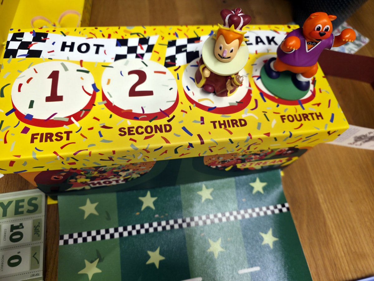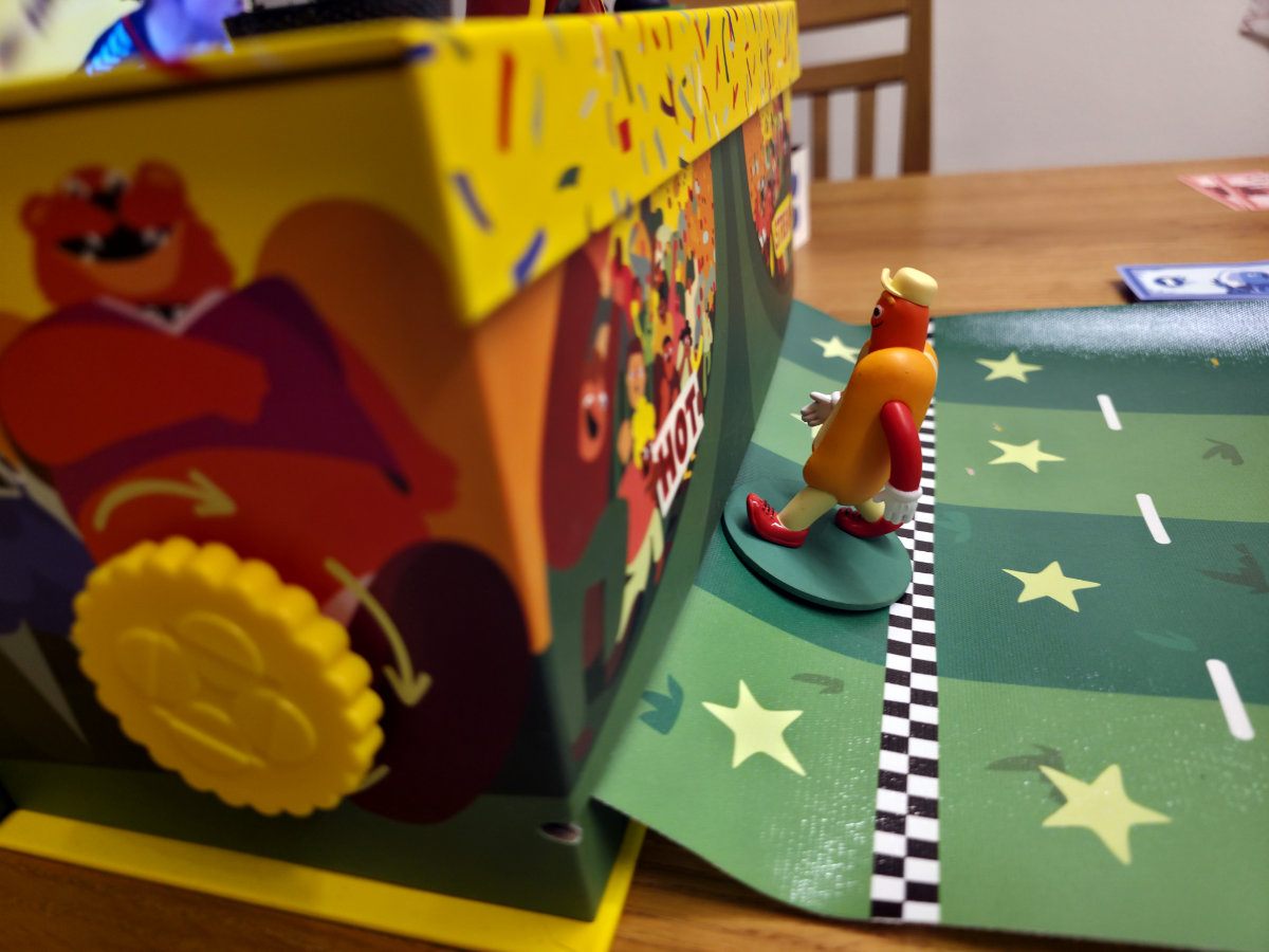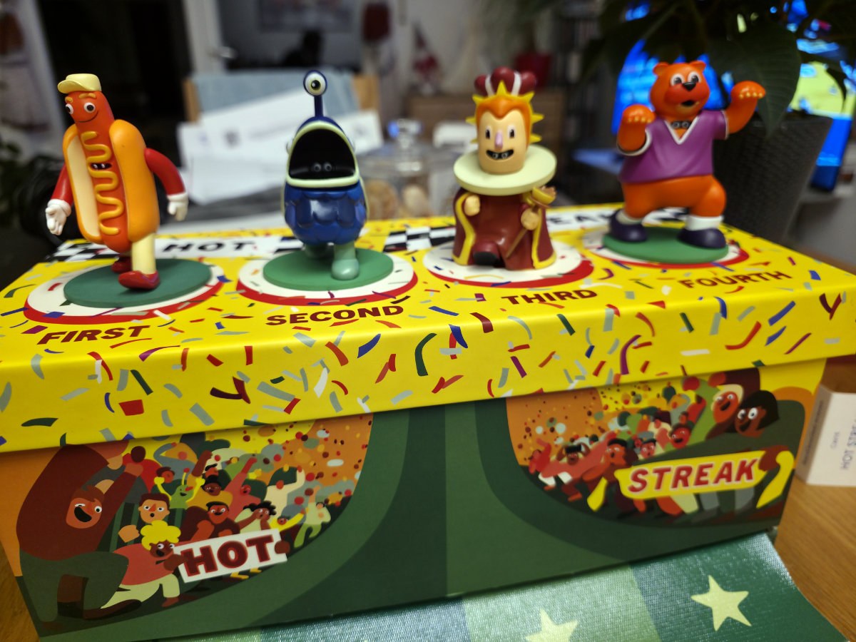 Da sitzt man mit Freunden ganz harmlos am Tisch und plötzlich verwandelt sich die Runde in ein Mini-Stadion voller schreiender Fans. Genau das ist die Grundidee von Hot Streak. Eine Bande von Glücksrittern, die auf die verrücktesten Maskottchen wettet – darunter ein Hotdog-Mann, ein überdimensionierter Tier-Charakter und andere herrlich absurde Figuren. Diese vier Plastik-Maskottchen starten auf einem langen, (aus der Spielschachtel) ausziehbaren Rennstreifen.