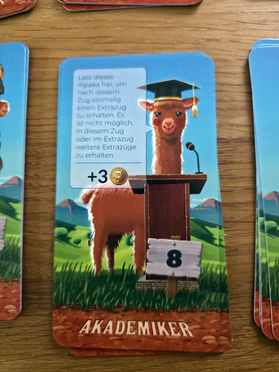 Die Fähigkeiten reichen von nützlich bis völlig verrückt. Ein paar Highlights sind z.B. der „Bibliothekar“ – zieht Karten, klar^^, der „Konsument“ wirft deine ganze Hand weg und gibt fünf neue Karten – nur als erste Aktion nutzbar, „Pantomime“ kopiert die Fähigkeit eines Alpakas im eigenen Gehege, also ein Alpaka, das so tut, als wäre es ein anderes Alpaka^^. Der „Hippie“ verschenkt ein Alpaka an einen Mitspieler und zieht dann drei Karten und der „Rocker“ springt in ein beliebiges Gehege – auch fremde – und macht das dortige Alpaka am Ende wertlos. Die „Zwillinge“ nehmen zwei Plätze ein, zählen aber auch doppelt. Der „Akademiker“ opfert sich selbst, um einen Extrazug zu schenken und die Snobs kosten zwar kein Geld, aber man muss zwei Alpakas freilassen. Die „Träumer“ versuchen sich am Spielende selbst gegen ein besseres Alpaka auszutauschen – ein bisschen wie ein Jobwechsel kurz vor der Rente^^.