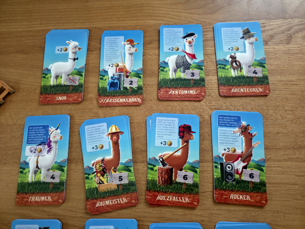 In der Tischmitte liegt der Marktplatz mit zwölf Stapel voller Alpakas, sortiert nach Wert. Von einfachen Bibliothekaren über nervöse Alpakas bis hin zu königlichen Hochkarätern ist alles dabei. Zwei Stapel – die adligen Alpakas und die Snobs – sind immer im Spiel. Der Rest wird ausgewählt oder zufällig zusammengestellt.