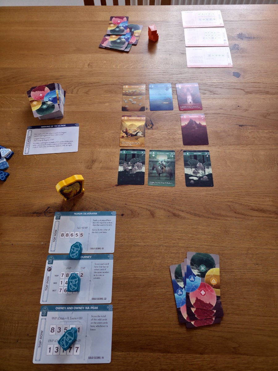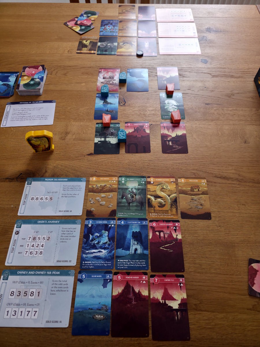 Unterm Strich ist „Tír na nÓg“ ein erstaunlich poetisches, aber zugleich klar strukturiertes Kartenspiel. Es ist recht schnell gespielt, hat klare Rundenabläufe, ist aber voller kleiner Verzahnungen und spannender Entscheidungen. Es ist kein epischer Brocken, sondern ein leicht bis moderat anspruchsvolles Spiel, das seine Tiefe eher aus Timing, Synergien und langfristiger Planung zieht, weniger aus Regelfülle.