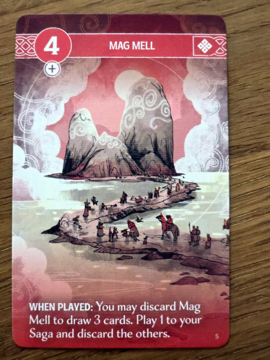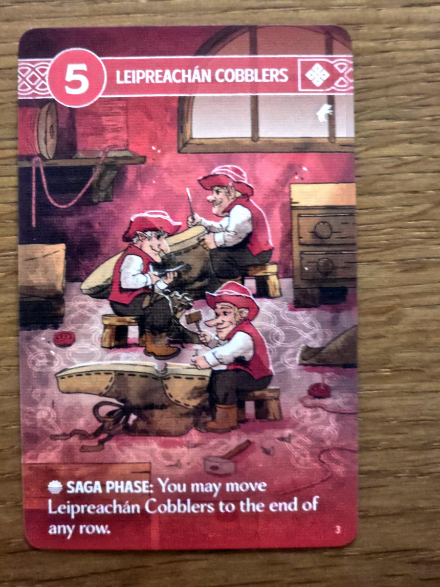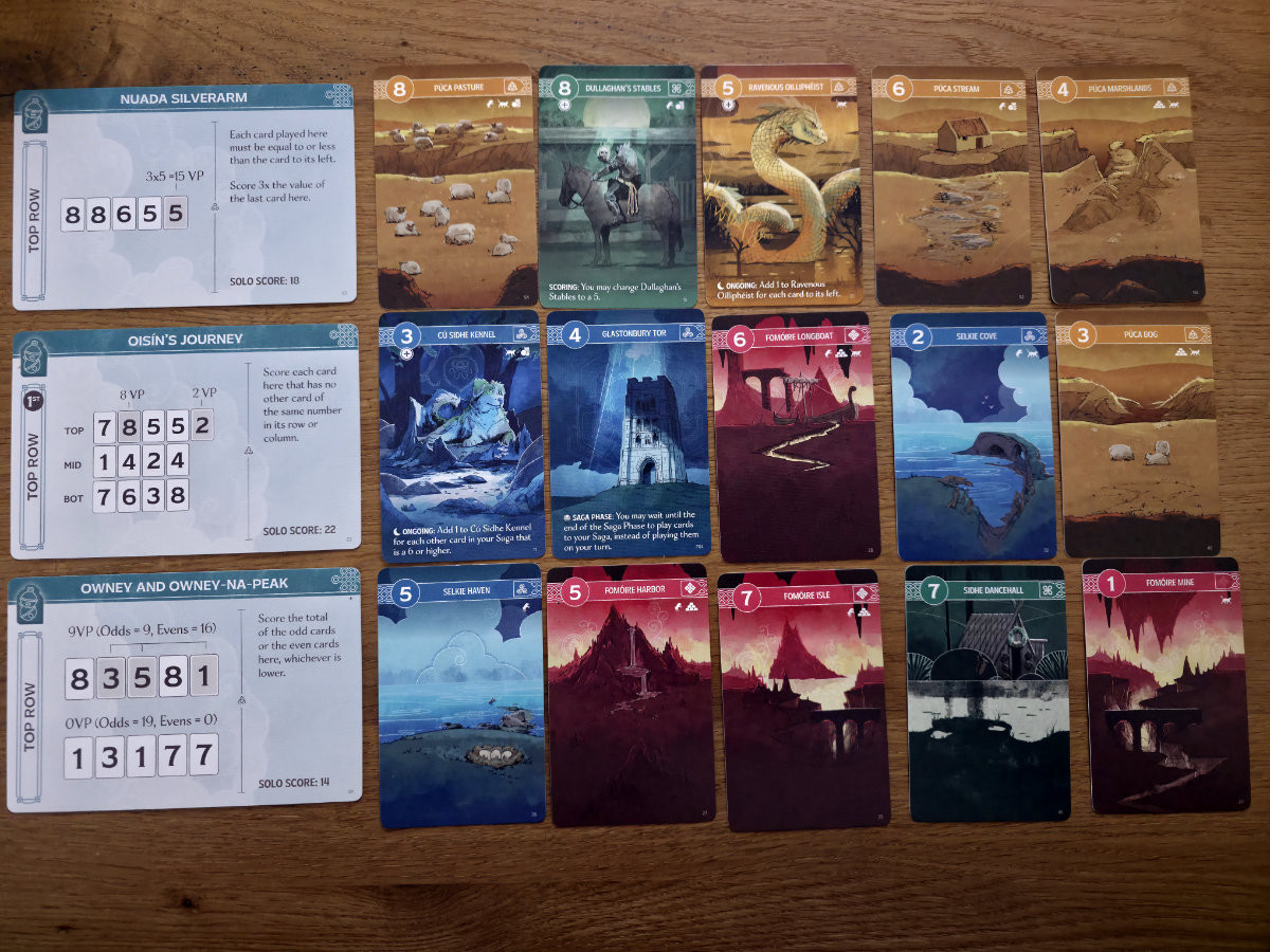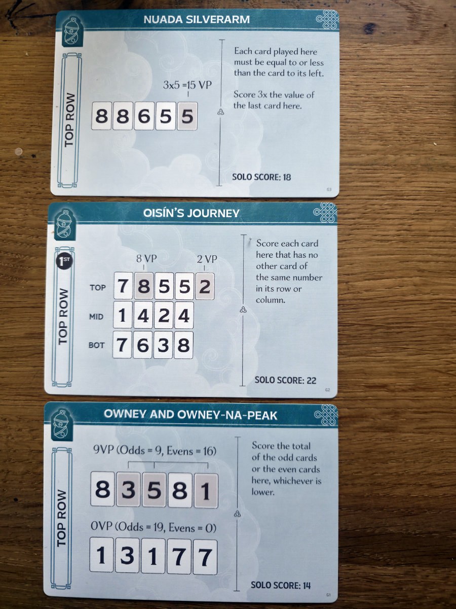 Kern des Spiels ist die persönliche Sage. Ein Raster aus drei Reihen zu je fünf Karten, das sich im Laufe von fünf Runden langsam füllt. Vor jeder Partie werden drei sogenannte „Geas“-Karten – Geas ist ein Begriff aus der irischen Mythologie für eine Art Verpflichtung, Gelübde oder Fluch – ausgesucht (jeder spielt mit den selben) und legt je eine für obere, mittlere und untere Reihe aus. Jede „Geas“-Karte schreibt zwei Dinge vor, zum einen besondere Platzierungsregeln (was darf hier rein, wie dürfen die Karten zueinander liegen), zum anderen eine ganz eigene Wertungslogik, wie diese Reihe am Spielende Punkte bringt. Mal sollen es aufsteigende Zahlenreihen, mal bestimmte Kombinationen, mal Mehrheiten oder Muster sein – immer mit ganz anderem Fokus. So fühlt sich jede Reihe wie ein eigenes kleines Puzzle an und man jongliert permanent drei unterschiedliche „Aufträge“, die sich meist auch noch gegenseitig beeinflussen.