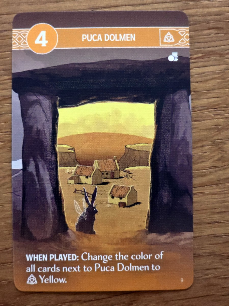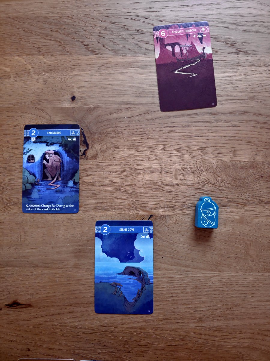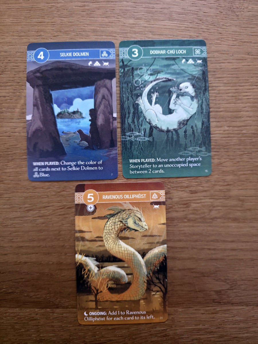 Die Karten selbst sind mehr als bloße Zahlen und Farben, sie tragen die mythischen Figuren, Orte und Motive der irischen Sagenwelt. Da gibt es „Banshees“, „Kelpies“, „Cú Sídhe“, den listigen „Far Darrig“, „heilige Hügel“, „Dolmen“, Seen und Täler. Viele dieser Karten haben Sonderfähigkeiten, die eine Sage ein wenig durchrütteln können. Manche erhöhen oder senken Kartenwerte, andere ändern Farben durch Marker, wieder andere lassen einen Karten verschieben oder vertauschen, zusätzliche Aktionen ausführen oder auf ungewöhnliche Weise mit dem Raster interagieren. Wichtig ist, dass diese Effekte erst beim Ausspielen in die Sage wirksam werden, nicht in der Hand. Und sie können Regeln des Grundspiels bewusst brechen. Karten bewegen sich an Stellen, die eigentlich längst „voll“ wären oder ignorieren Platzierungseinschränkungen der „Geas“-Karten. Das macht das Regelgerüst erfreulich dynamisch. Und durch die Marker für Wert- und Farbänderungen behält man jederzeit den Überblick, welche Karte sich wie verändert hat.
