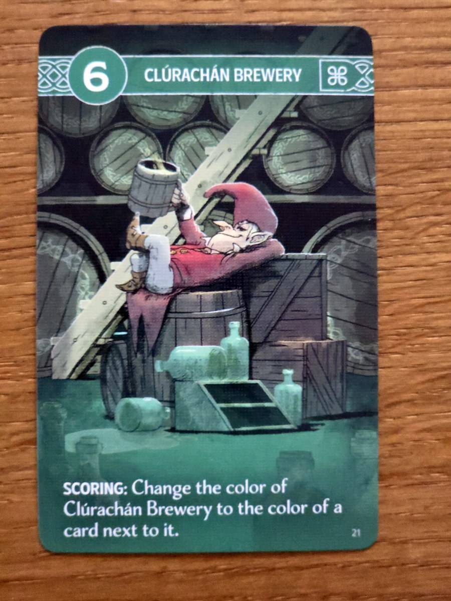 Ein weiterer Reiz von „Tír na nÓg“ liegt auch im zweiten Wertungsbein, den farbigen Regionen. Alle Begegnungskarten gehören zu einer von vier Farben und am Spielende wird für jede dieser Farben geschaut, wer die größte zusammenhängende Region hat – also orthogonal verbundene Karten gleichen Farbtons über alle drei Reihen hinweg. Eine Regionskarte vergibt dafür Mehrheitenpunkte. Die größte Region einer Farbe bringt die höchste Punktzahl, die zweitgrößte eine kleinere und wer nur vereinzelte Karten hat, geht leer aus.