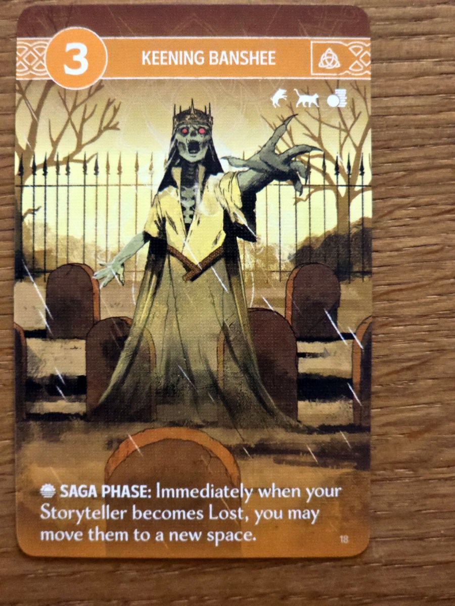 Besonders elegant ist der Umgang mit „verlorenen“ Geschichtenerzählern. Sobald alle Karten neben einer der Erzähler-Figuren weggenommen wurden, gilt diese als „verloren“ in der Anderswelt. Man setzt dann erst mal aus, während die anderen weiter Karten nehmen. Stehen am Ende der normalen Auswahl nur noch verlorene Erzähler im Raster, beginnt die „Echtra“-Quest – eine Art Nachschlag-Runde für alle, deren Figuren gestrandet sind. Nun nimmt man reihum, wieder gegen den Uhrzeigersinn, beliebige Karten aus dem Raster – nicht mehr auf die Nachbarschaft beschränkt – und baut sie in die eigene Sage ein. So entsteht ein reizvoller Spannungsbogen. Manchmal ist es verlockend, sich bewusst zu „verlieren“, um später in dieser Sonderphase ganz frei aus den Restkarten zu wählen. Gleichzeitig ist es natürlich riskannt, denn man weiss ja nie so genau, was bis dahin übrig bleibt.