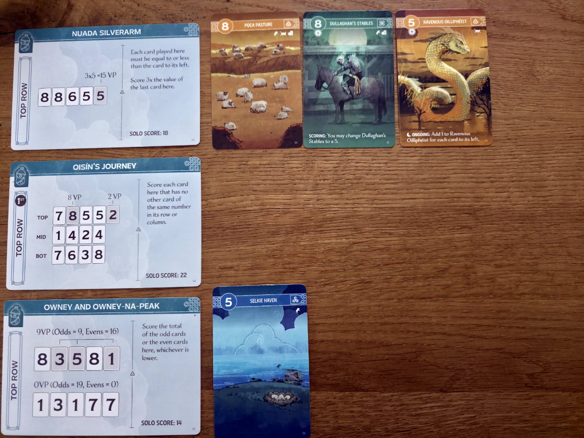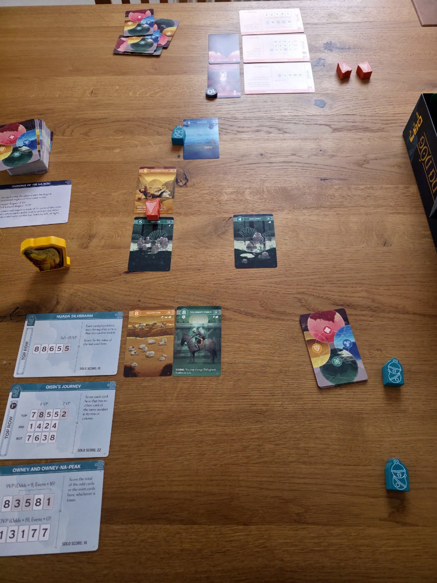 Auch solo denkt „Tír na nÓg“ das Thema weiter. Dort spielt man gegen „Balor“, den gefürchteten Anführer der „Fomóire“, der seine eigene Version der Geschichten schreiben will. „Balor“ legt kein eigenes Tableau an, sondern sammelt Karten in einem separaten Stapel und entscheidet sich aufgrund einer kleinen, simplen Logik immer für die jeweils höchsten oder niedrigsten Summen beziehungsweise Werte. Die Aufgabe des Solisten aber bleibt die gleiche, eine starke Sage aufbauen, während man zusehen muss, wie Balor einem wichtige Karten vor der Nase wegschnappt und am Ende mit seinen gesammelten Farben gegen die eigene Regionenwertung antritt. Schwierigkeitsgrade lassen sich über das spätere Abwerfen eines Teils seiner Karten justieren. Mechanisch ist dieses Solo-Modul schlank, aber es passt atmosphärisch gut zur Grundidee des Spiels, dass verschiedene Stimmen um die Deutungshoheit der mythischen Ereignisse ringen.