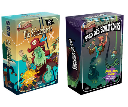 Im Brettspiel Die Schatzkarte schippern die Spielenden im Piratenschiff von Insel zu Insel, immer auf der Suche nach dem nächsten Schatz. Dabei interagiert die zugehörige App mit dem Spiel, wenn man die Karte von Papa Juju scannt – der mit seinen Regeln gerne alles durcheinanderbringt! Wer am Ende das meiste Gold angehäuft hat, gewinnt. Die Schatzkarte enthält zusätzlich zum Brettspiel das App-gestützte Spielbuch „Käptn Gruselbarts Fluch“. Darin geht es um das Erbe des namensgebenden Käpt’n Gruselbart – Schritt für Schritt in kurzen Kapiteln erzählt, ergänzt durch interaktive Herausforderungen in der App. Durch Scannen der Illustrationen im Spielbuch lassen sich spannende Seegefechte bestreiten und knifflige Rätsel lösen, um das nächste Kapitel zu erreichen.