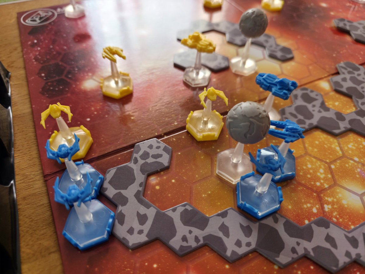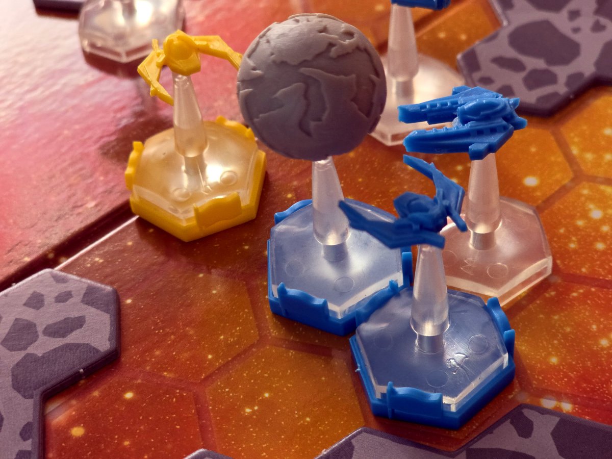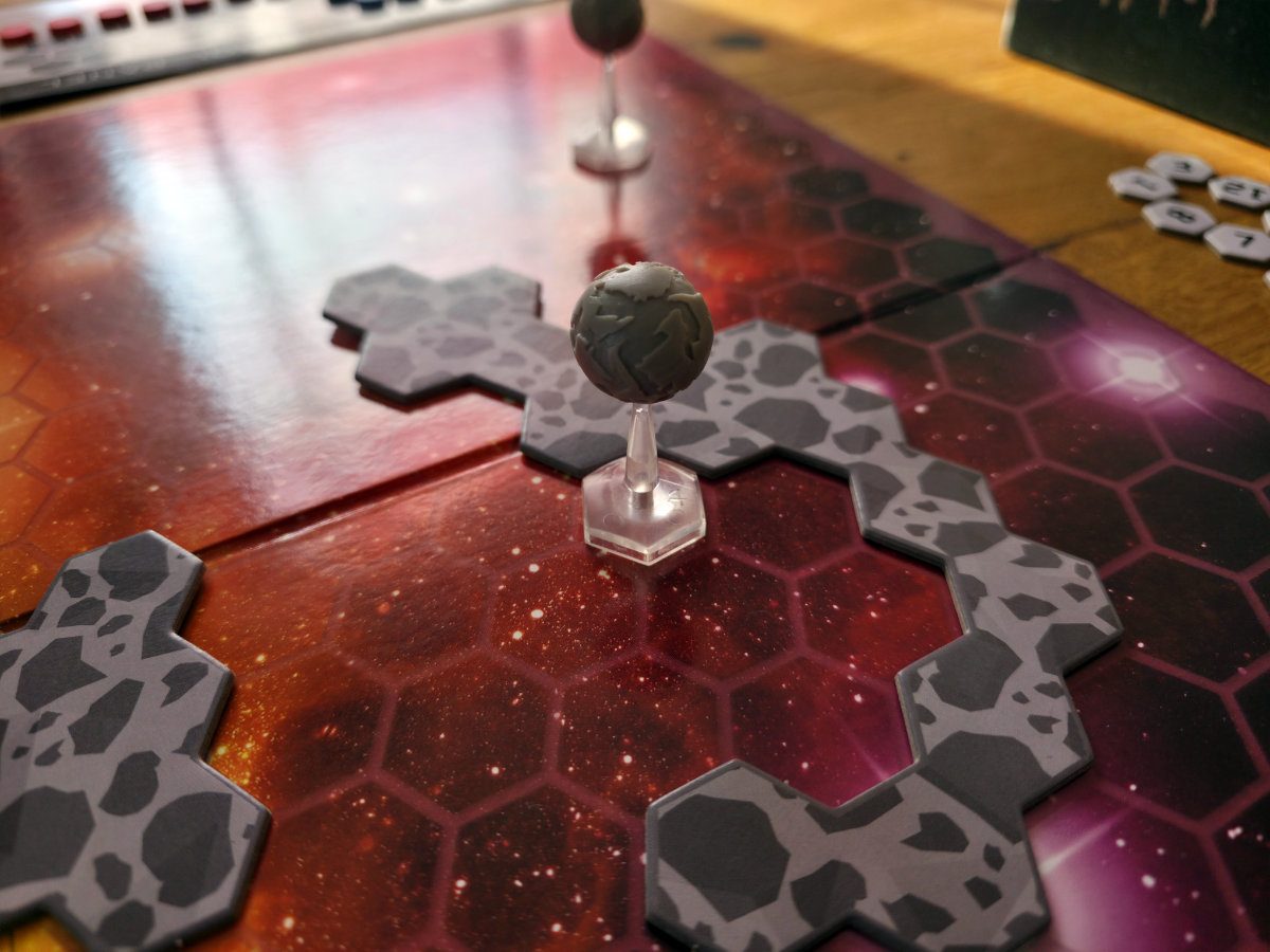 Asteroidenfelder sind ein weiteres Element, das das Spielbrett dynamisch macht. Sie blockieren Bewegungen, können aber durchflogen werden – allerdings nur, wenn man einen Dogfight gegen das Feld gewinnt. Asteroiden würfeln immer einen W6 und wer verliert, explodiert. Das ist herrlich thematisch und sorgt für Momente, in denen man sich fragt: „ööööööööööööööWage ich es? Oder fliege ich außen herum und verliere Zeit?“