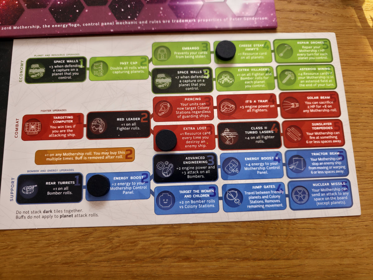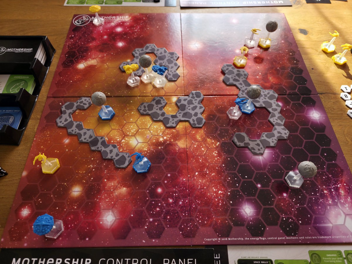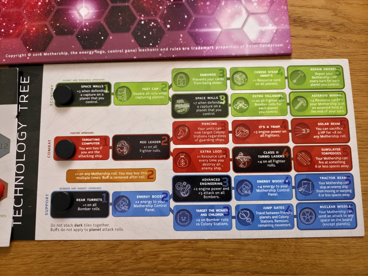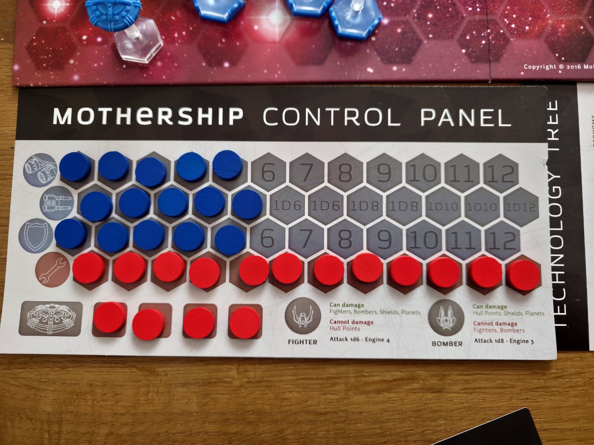 Das ikonische Element von „Mothership“ ist die eigene Kontrolltafel – ein kleines Tableau, auf dem mit blauen Energiewürfeln die Systeme des Mutterschiffs konfiguriert werden. Vor jeder Bewegung entscheidet man, wie viel Energie in den Antrieb, die Waffensysteme oder die Schutzschilde gepumpt werden. Mehr Antrieb bedeutet größere Reichweite, mehr Waffen ein stärkerer Würfel, mehr Schilde eine höhere Überlebenschance. Diese Energie bleibt bis zum nächsten Zug „eingefroren“, was das Spiel zu einem ständigen Balanceakt macht. Man plant voraus, riskiert aber gleichzeitig, mit einer falschen Einstellung in einen möglichen Hinterhalt zu geraten.