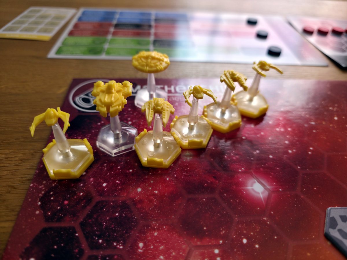 Ein Spiel über Energie, Risiko und explosive Entscheidungen. Im Kern ist „Mothership“ ein taktisches Miniaturenspiel, das sich erstaunlich flott spielt und dennoch eine überraschende Tiefe entfaltet. Jeder Spieler kontrolliert eine kleine Flotte bestehend aus einer mächtigen „Mutterschiff“-Einheit, einigen wendigen Kampfjägern, schwerfälligen Bombern sowie einer verwundbaren, aber spielentscheidenden Basisstation. Diese Station ist der Lebensnerv jedes Spielers. Fällt sie, ist man sofort aus dem Spiel – egal, wie viele Schiffe man noch hat. Das erzeugt von Anfang an eine klare Linie, denn Angriffslust und Verteidigungsnotwendigkeit stehen permanent im Konflikt.