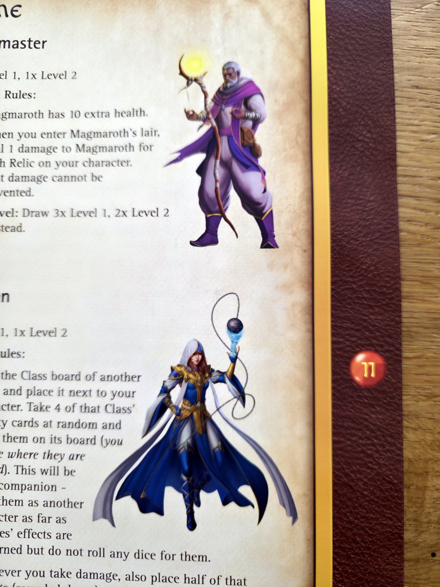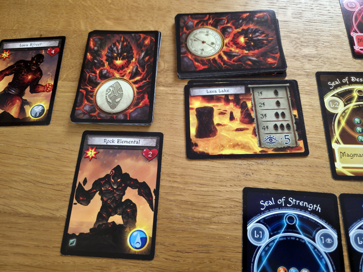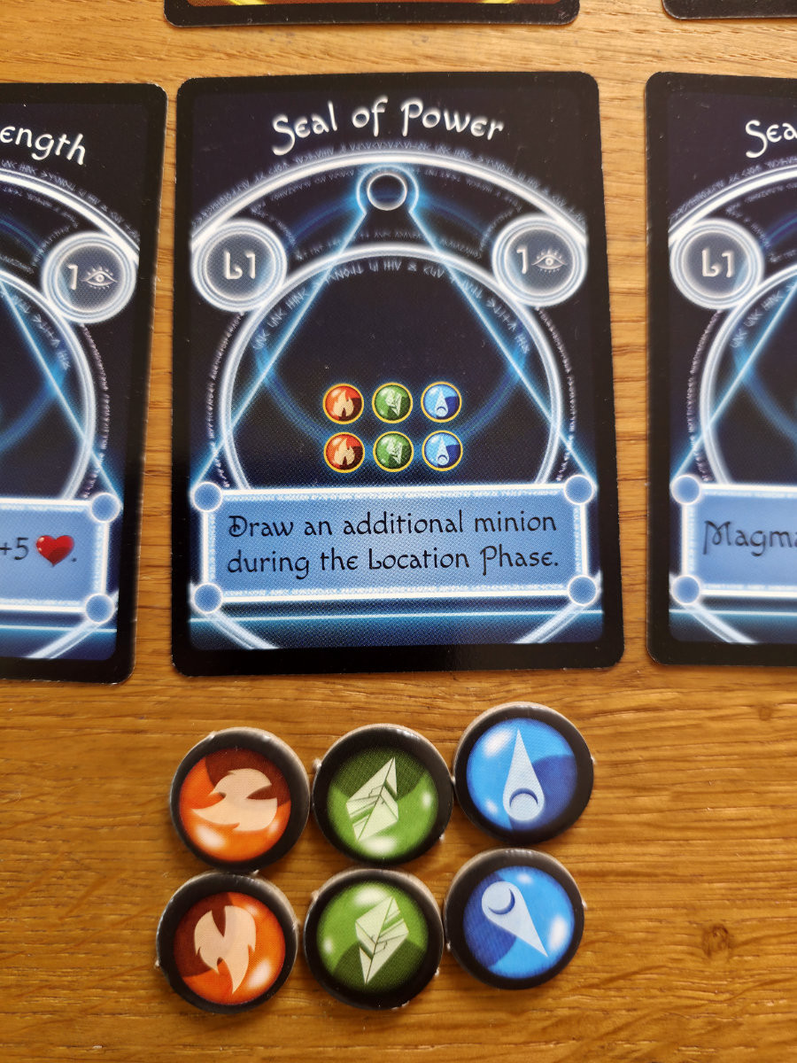 Nach neun Runden erreicht die Gruppe schließlich Magmaroths Lair. Ab hier wird das Spiel härter, direkter, brutaler. Die Seals – magische Barrieren, die Magmaroth schützen – entfalten nun ihre Effekte. Manche erhöhen seine Lebenspunkte, andere erschweren Aktionen oder verstärken die Minions. Die Spieler müssen diese Siegel brechen, indem sie Mana investieren, das sie über mehrere Runden ansammeln können. Gleichzeitig greifen nun sowohl Minions als auch Magmaroth selbst an. Die Anleitung bringt es trocken auf den Punkt: „Magmaroth attacks along with the Minions.“. Am Tisch fühlt es sich an wie ein verzweifelter Endkampf, bei dem jede Entscheidung zählt.