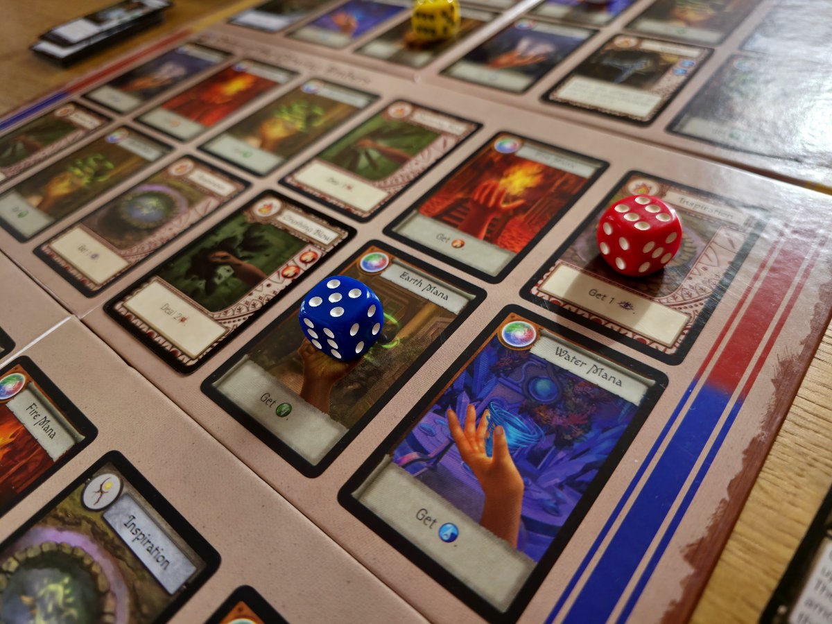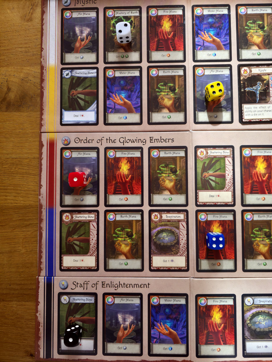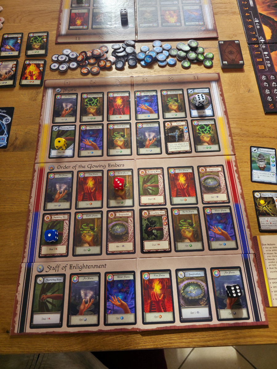 Der Kern des Spiels liegt in der Action Phase, in der die Spieler ihre Würfel einsetzen. Jeder Würfel liegt zu Beginn der Runde auf einer Fähigkeit des eigenen Charakters. Entfernt man ihn, löst man diese Fähigkeit aus – sei es Schaden, Heilung, Manaerzeugung oder das Verschieben anderer Würfel. Das System ist ein kleines taktisches Puzzle: Man jongliert mit Positionen, Effekten und Timing, während man gleichzeitig versucht, die Mitspieler zu unterstützen. Die Regeln betonen ausdrücklich, wie wichtig Kooperation ist: „Do not focus only on what your character can do… Provide Assistance to someone else.“. Und tatsächlich: Ohne gegenseitige Hilfe geht man unter.
