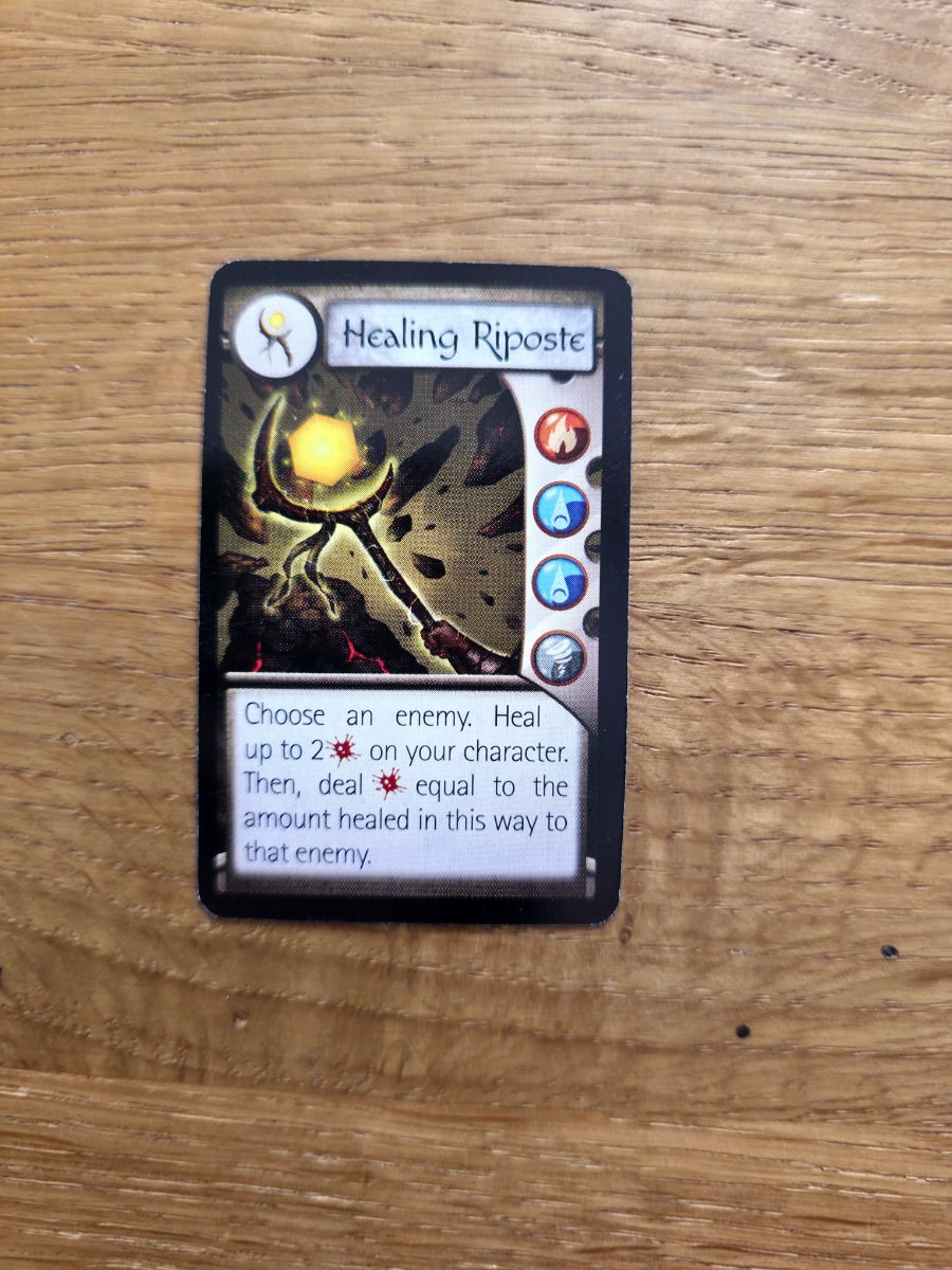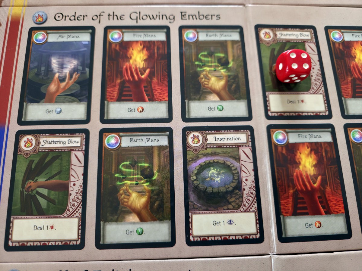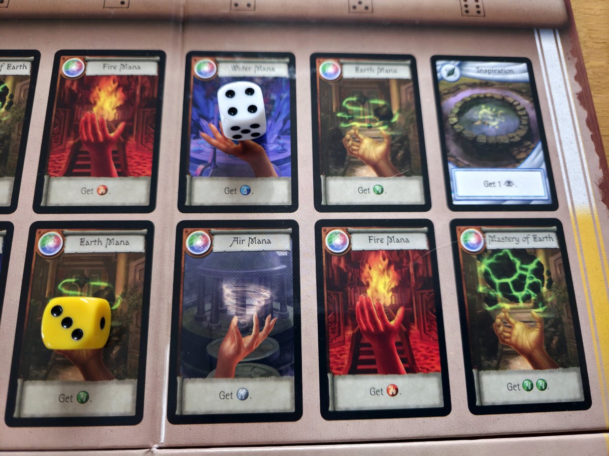 Mana spielt eine zweite große Rolle. Es dient nicht nur als Ressource für Elementaraktionen – etwa zusätzlich Schaden zu verursachen oder Minions zu betäuben –, sondern auch als Währung, um neue Fähigkeiten zu meistern. Diese neuen Karten legt man direkt auf das eigene Tableau, wodurch der Charakter im Laufe der Partie immer stärker wird. Ein schönes Detail: Legt man eine neue Fähigkeit auf ein Feld, das zuvor beschädigt wurde, heilt man diesen Schaden automatisch. Das Spiel ermutigt also, Schaden taktisch zu verteilen und später durch kluges Aufrüsten wieder zu entfernen.
