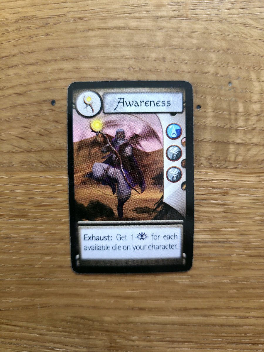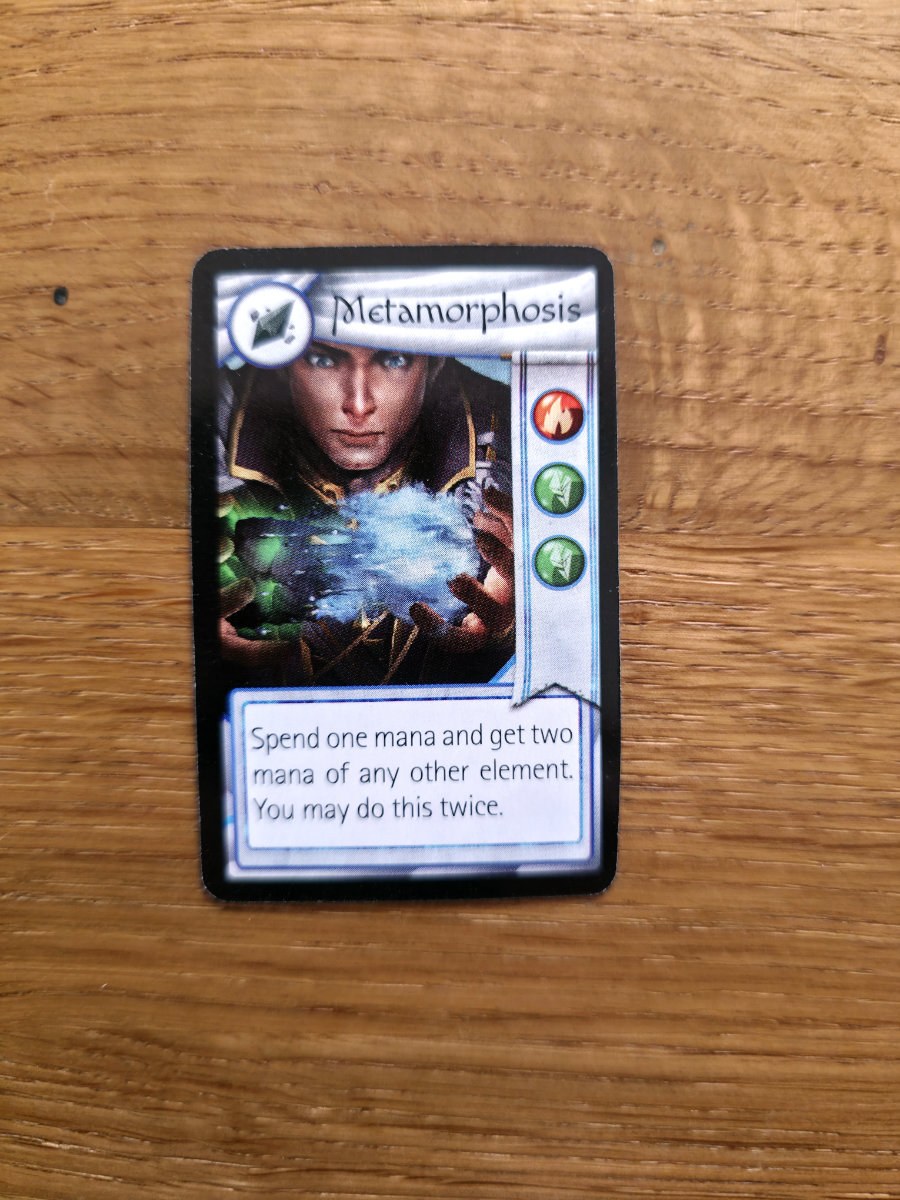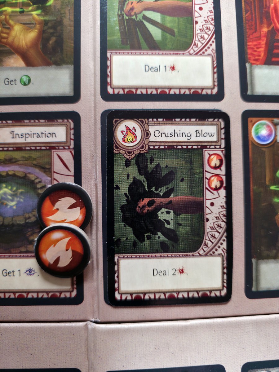 Mana spielt eine zweite große Rolle. Es dient nicht nur als Ressource für Elementaraktionen – etwa zusätzlich Schaden zu verursachen oder Minions zu betäuben –, sondern auch als Währung, um neue Fähigkeiten zu meistern. Diese neuen Karten legt man direkt auf das eigene Tableau, wodurch der Charakter im Laufe der Partie immer stärker wird. Ein schönes Detail: Legt man eine neue Fähigkeit auf ein Feld, das zuvor beschädigt wurde, heilt man diesen Schaden automatisch. Das Spiel ermutigt also, Schaden taktisch zu verteilen und später durch kluges Aufrüsten wieder zu entfernen.