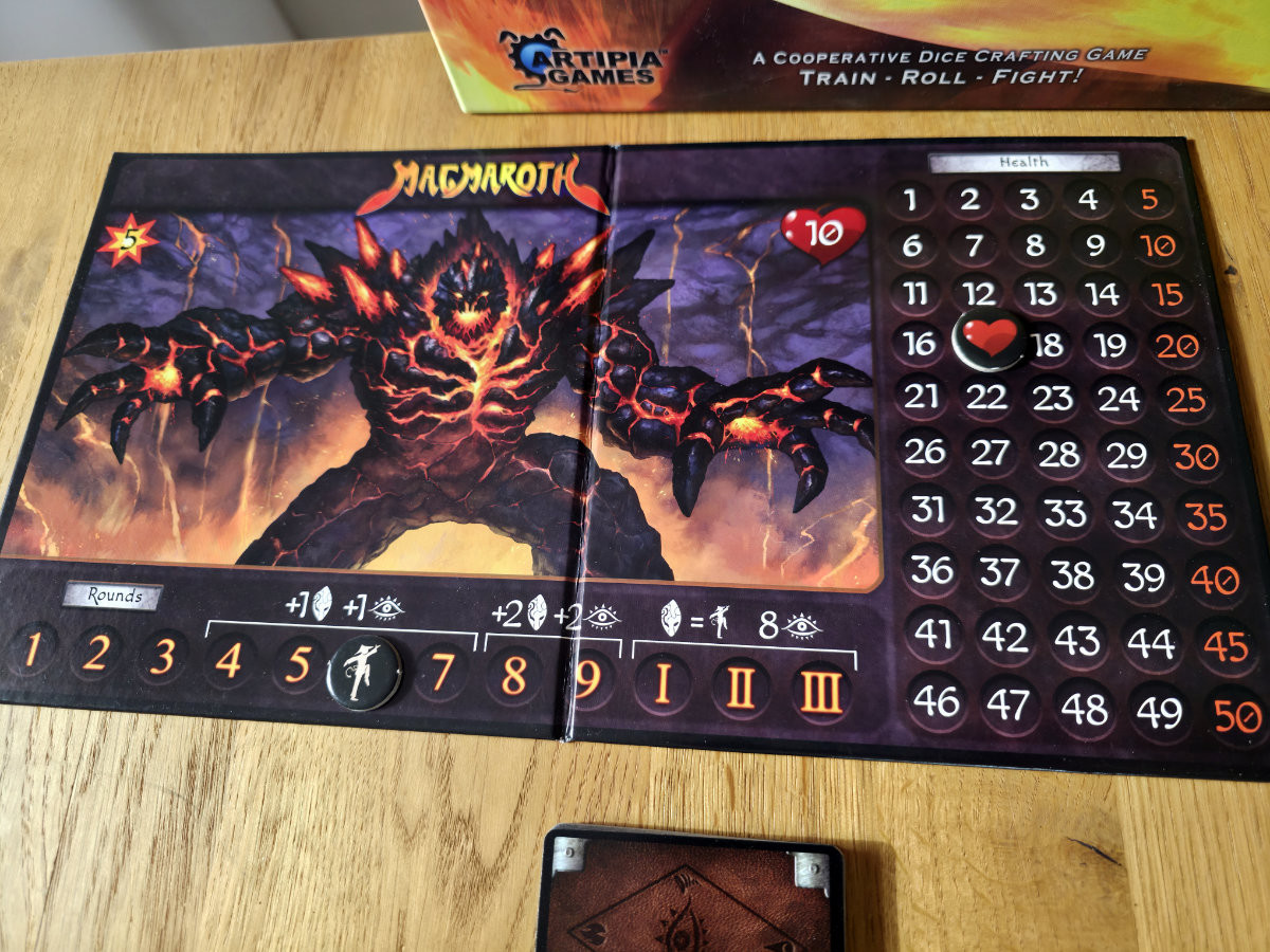 Review-Fazit zu „The Masters‘ Trials: Wrath of Magmaroth“, einem kooperativen Würfel- und Ressourcenmanagementspiel.