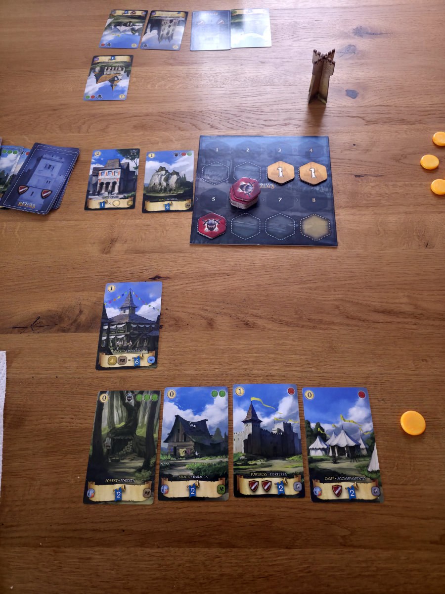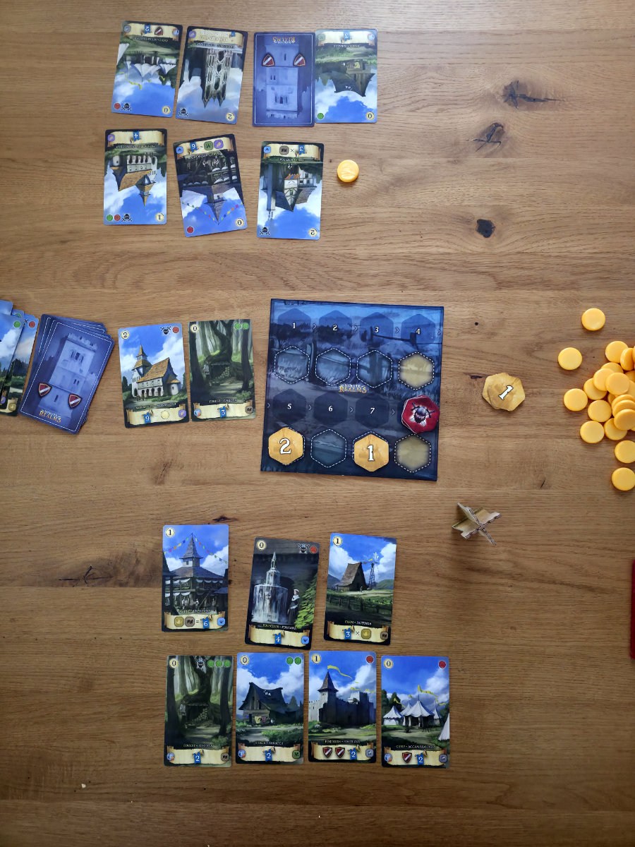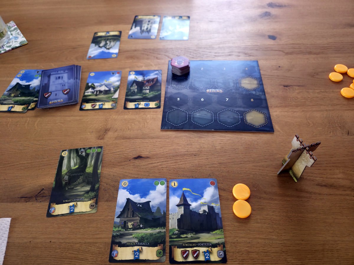 Gebaut wird entweder offen – für Punkte, Effekte und Synergien – oder verdeckt als Bastion, die die eigene Verteidigung stärkt. Und diese Verteidigung braucht man, denn nach Runde vier und acht rollen die Invasoren an. Wer nicht genug Schilde hat, verliert ein Gebäude, was sich im kleinen Königreich sofort schmerzhaft bemerkbar macht. Gleichzeitig winken am Ende Bonuspunkte, wenn man die zweite Invasion erfolgreich abwehrt, was das Spiel in ein herrlich nervöses Ressourcen‑Management verwandelt – baut man nun für Punkte oder für Schutz?
