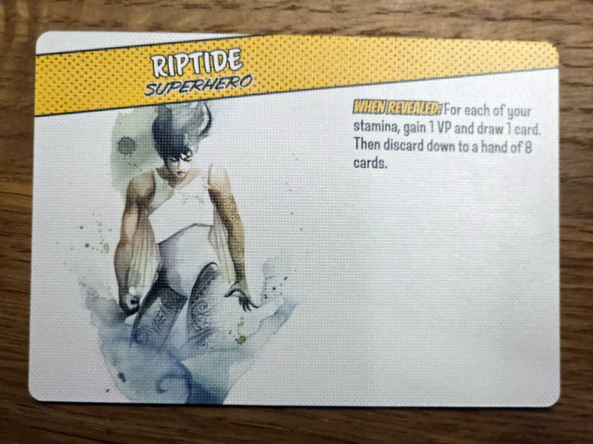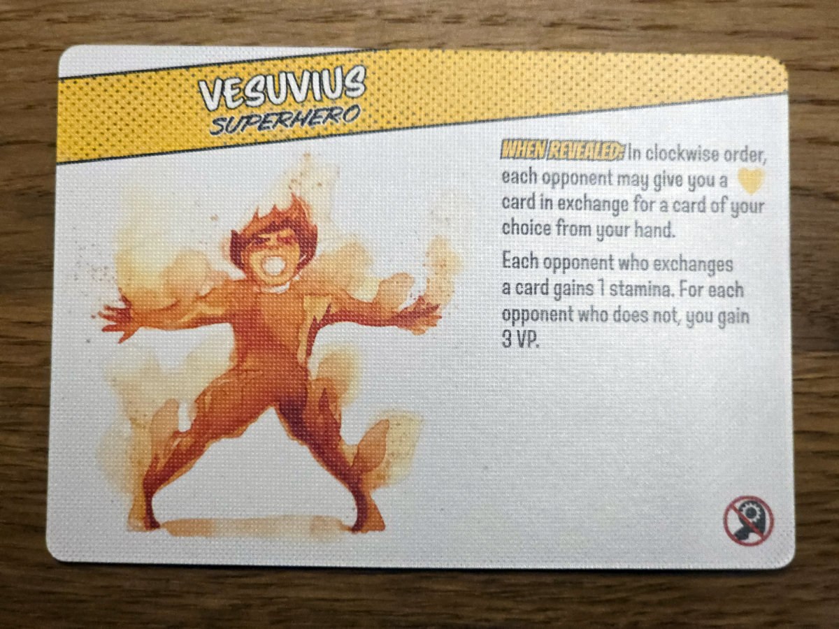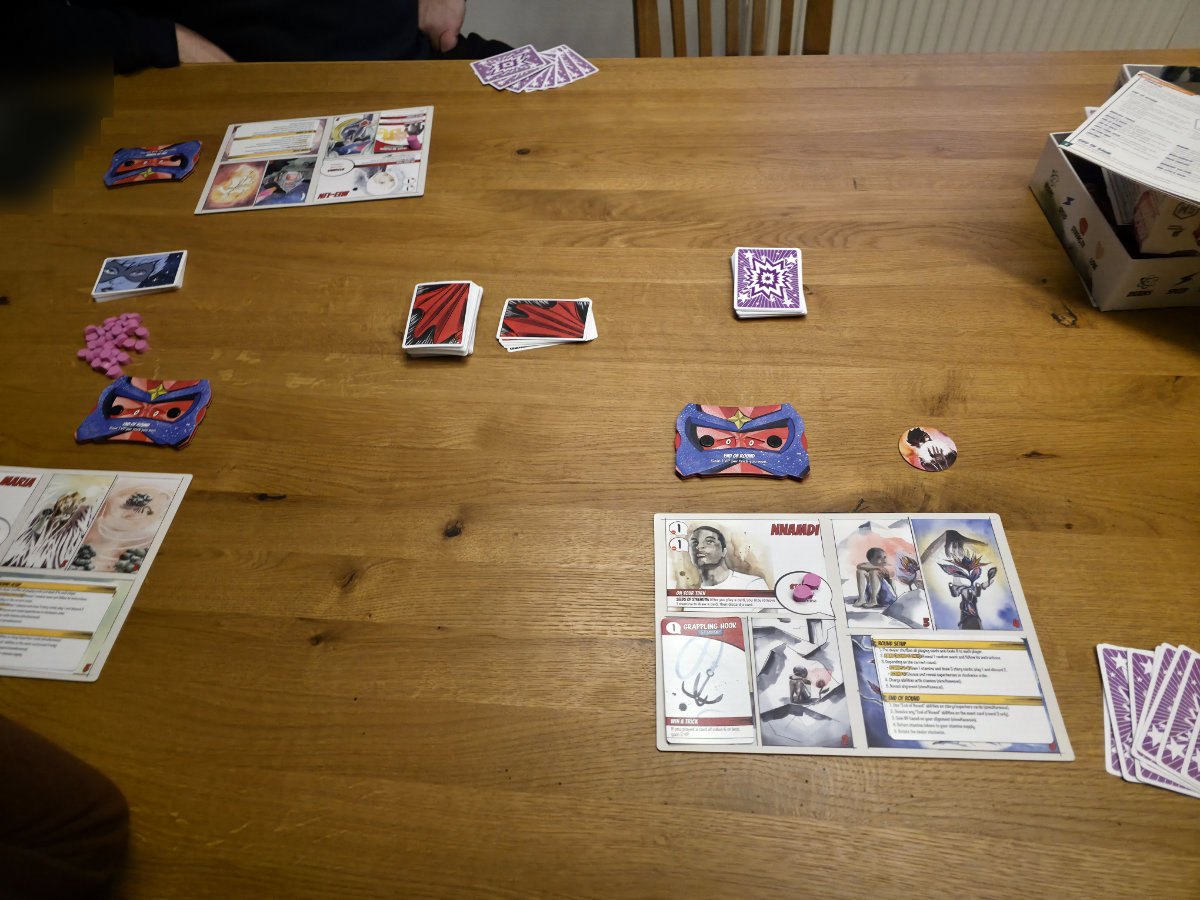 Besonders spannend wird es in Runde drei, wenn ein zufälliges Ereignis ins Spiel kommt. Diese Ereigniskarten verändern die Regeln oder die Punkteverteilung und sorgen dafür, dass keine Partie der anderen gleicht. In Runde fünf schließlich enthüllt jeder seine Superheldenkarte – ein finaler, mächtiger Effekt, der das letzte Kapitel der eigenen Geschichte prägt und oft den entscheidenden Unterschied macht – zu Beginn erhält jeder zwei hiervon, lässt diese aber verdeckt bei sich liegen, mit der Spielübersichtsseite nach oben, um die Überraschung nicht zu verderben.