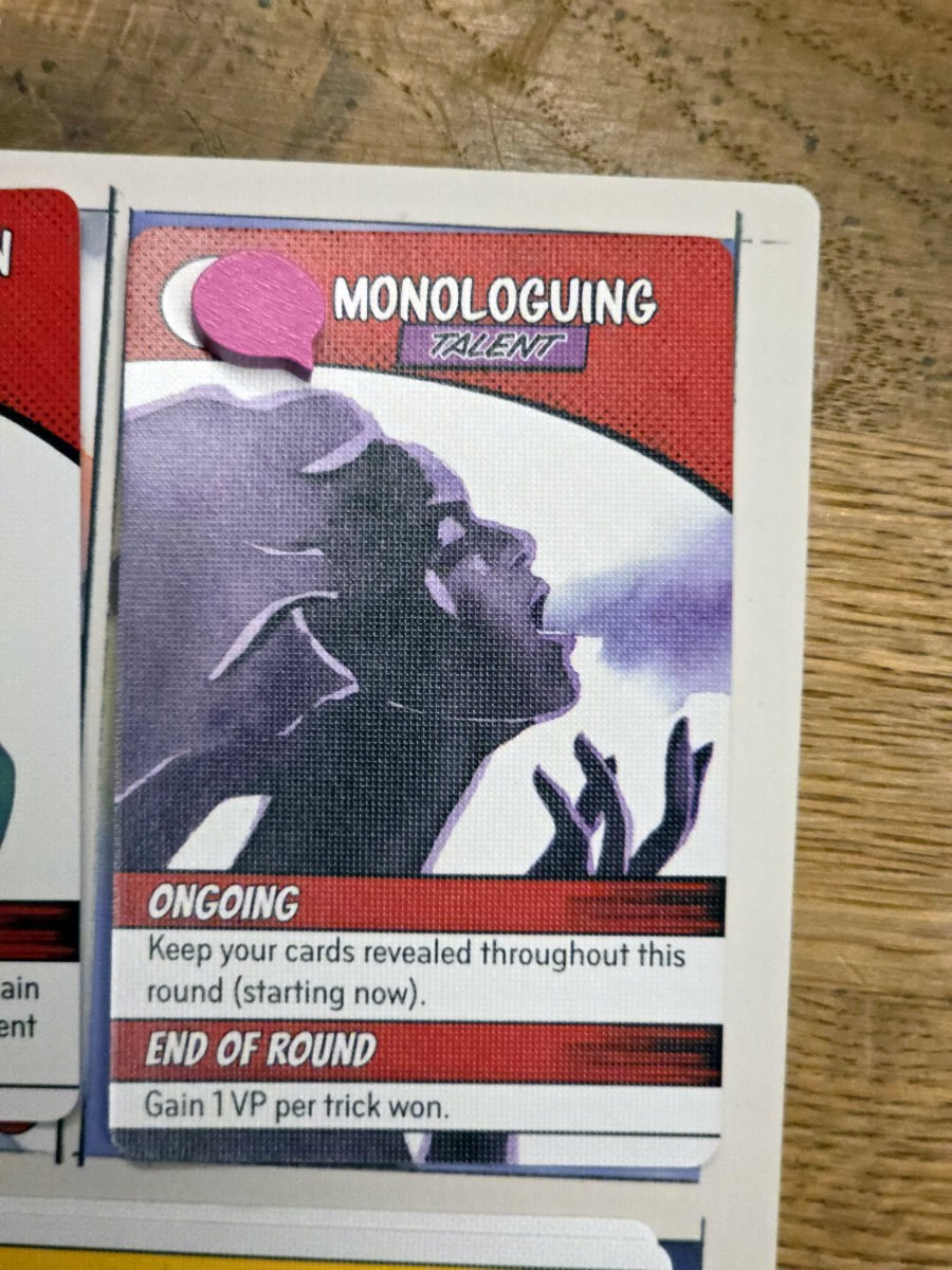 Der Kern des Spiels ist ein klassisches Stichspiel mit vier Farben, hier grün (Gehirn), gelb (Liebe), blau (Geschwindigkeit) und rot (Stärke). Liebe fungiert dabei als Trumpf – ein charmantes Detail, das dem Spiel eine gewisse Ironie verleiht. Acht Stiche pro Runde, fünf Runden insgesamt. Doch bevor die Karten fliegen, lädt man seine Fähigkeiten mit Stamina auf, einer Art Energie, die man im Laufe der Partie sammelt. Nur geladene Fähigkeiten können genutzt werden und die Entscheidung, welche Kräfte man aktiviert, ist oft genauso spannend wie das eigentliche Ausspielen der Karten. Manche Fähigkeiten greifen vor einem Stich, andere während des eigenen Zuges, wieder andere erst am Ende einer Runde. Einige erlauben es, Karten zu manipulieren, Stiche umzulenken oder sogar die eigene Ausrichtung zu verändern.