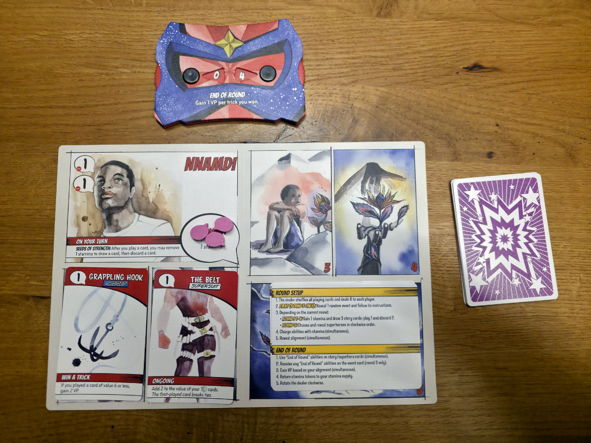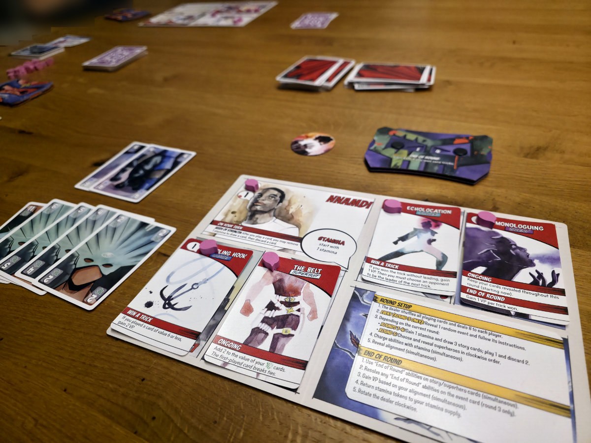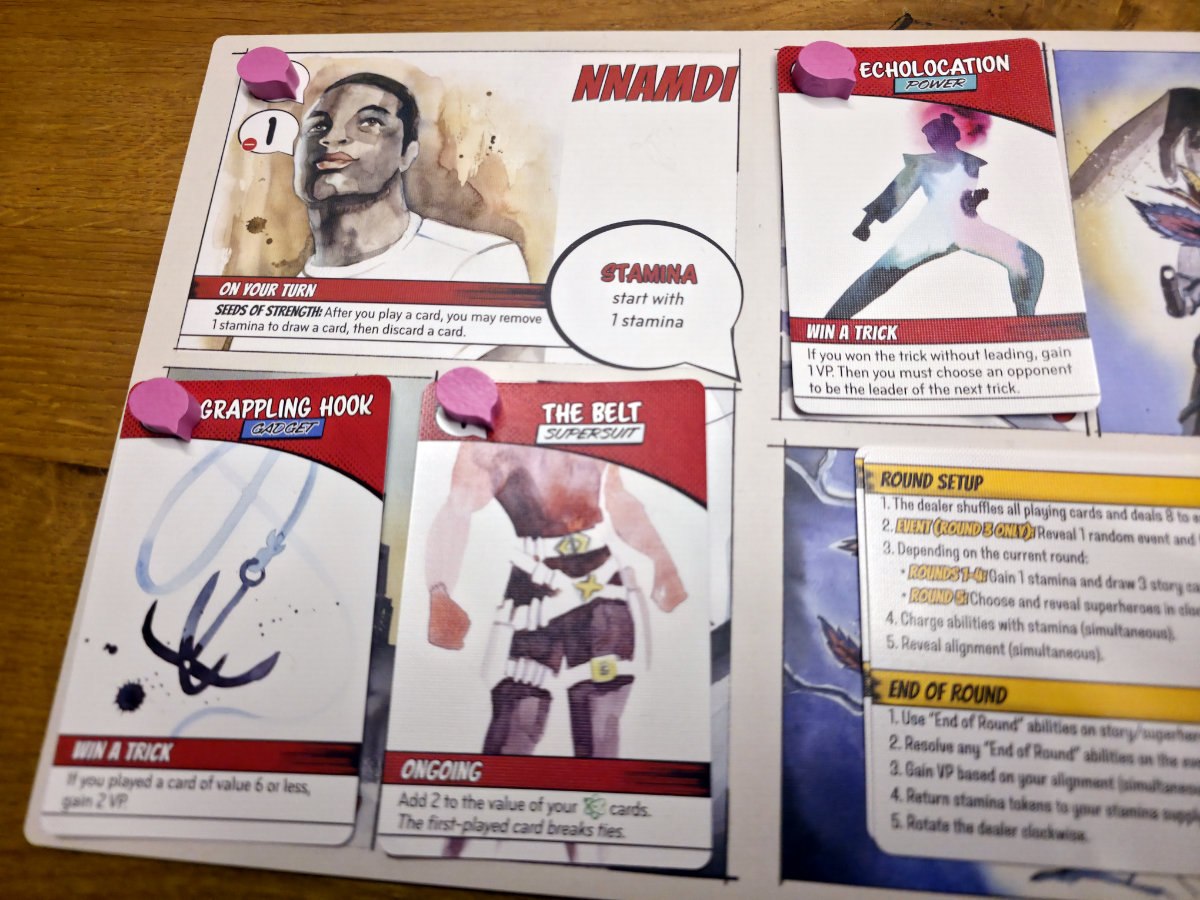 Zu Beginn erhält jeder Spieler eine Charaktertafel – die Grundlage der eigenen Identität. Im Laufe der fünf Runden, die jeweils ein Kapitel der Entstehungsgeschichte darstellen, kommen vier Storykarten und schließlich eine Superheldenkarte hinzu. Diese Karten bilden den Hintergrund des Charakters. Diese zeigen nicht nur thematisch die Entwicklung des Charakters, sondern schalten auch spielmechanisch immer mehr Fähigkeiten frei. So beginnt jede Runde damit, dass man neue Storykarten zieht, eine davon auswählt und auf das eigene Tableau legt. Diese Karten können dann Fähigkeiten auslösen, Werte verändern oder sogar die Regeln des Stichspiels brechen – ganz so, wie man es von übernatürlichen Kräften erwarten würde^^.
