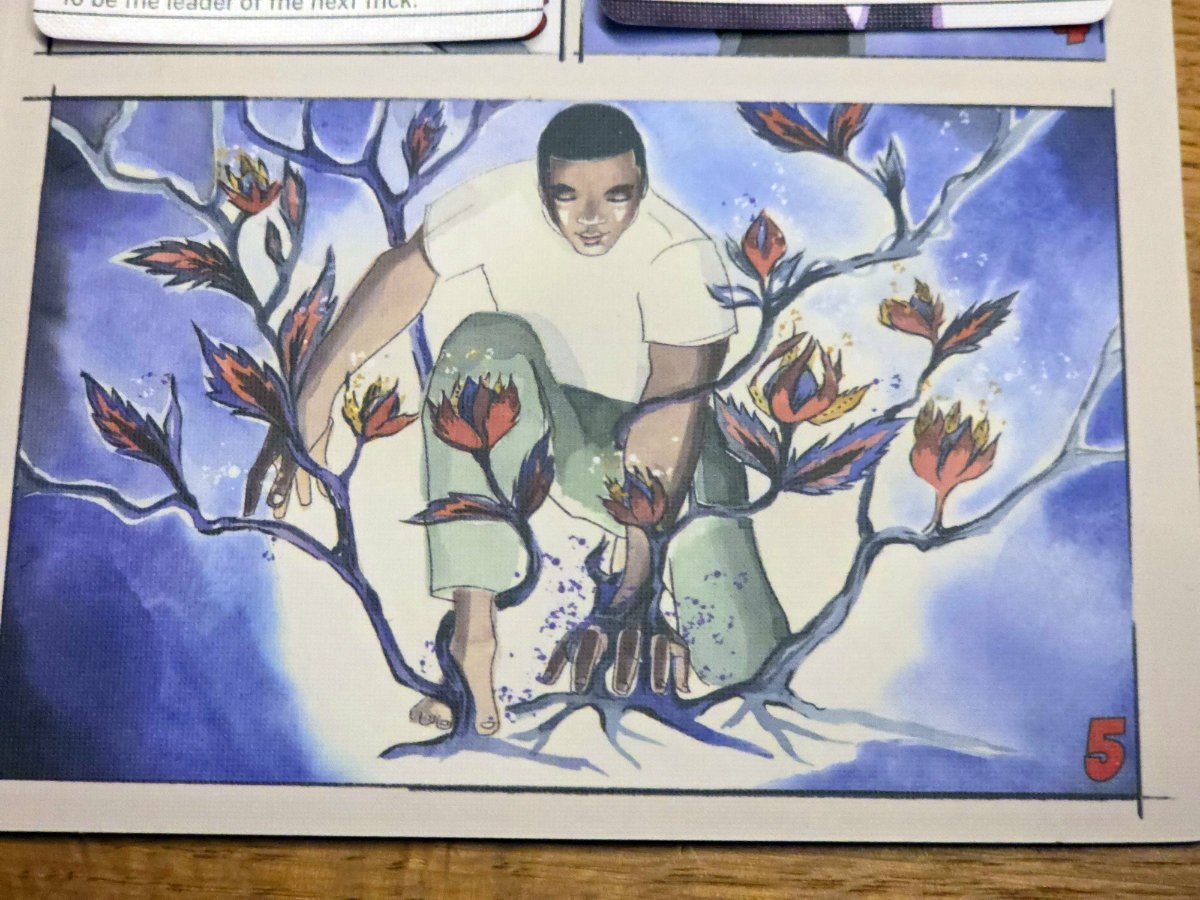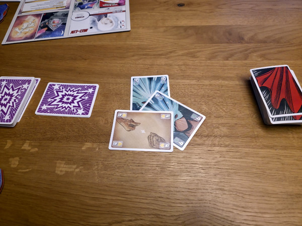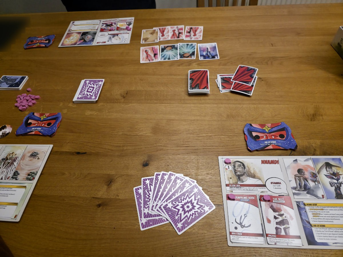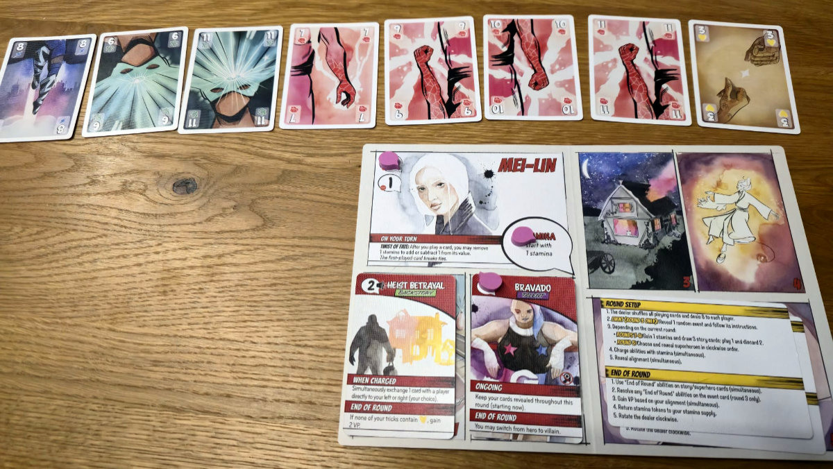 Zu Beginn erhält jeder Spieler eine Charaktertafel – die Grundlage der eigenen Identität. Im Laufe der fünf Runden, die jeweils ein Kapitel der Entstehungsgeschichte darstellen, kommen vier Storykarten und schließlich eine Superheldenkarte hinzu. Diese Karten bilden den Hintergrund des Charakters. Diese zeigen nicht nur thematisch die Entwicklung des Charakters, sondern schalten auch spielmechanisch immer mehr Fähigkeiten frei. So beginnt jede Runde damit, dass man neue Storykarten zieht, eine davon auswählt und auf das eigene Tableau legt. Diese Karten können dann Fähigkeiten auslösen, Werte verändern oder sogar die Regeln des Stichspiels brechen – ganz so, wie man es von übernatürlichen Kräften erwarten würde^^.