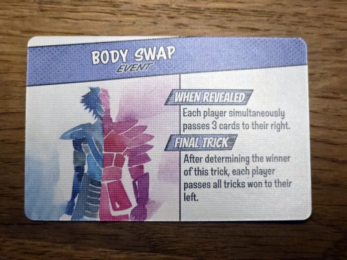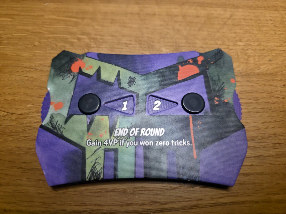 Die Ausrichtung ist ein zentrales Element. In jeder Runde entscheidet man sich, ob man als Held oder als Schurke spielt. Helden wollen möglichst viele Stiche gewinnen, denn jeder Stich bringt einen Siegpunkt. Schurken hingegen versuchen, keinen einzigen Stich zu gewinnen – gelingt ihnen das, erhalten sie vier Punkte auf einen Schlag. Diese Entscheidung sorgt für eine herrliche Dynamik, denn sie beeinflusst nicht nur die eigene Strategie, sondern auch die Erwartungen der Mitspielenden. Ein Spieler, der plötzlich zum Schurken wird, kann die gesamte Runde auf den Kopf stellen. Festgelegt wird dies durch das entsprechende Umdrehen (gute Seite, böse Seite) der eigenen Punktetafel, die mit Drehscheiben versehen immer den aktuellen Stand beidseitig anzeigt.