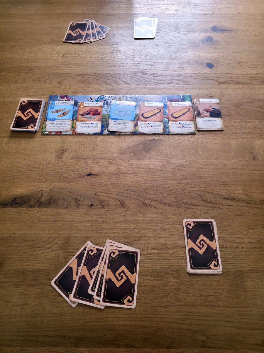 Die Aufräumphase füllt die Kartenhand wieder auf fünf auf. Im „Markt“ werden Lücken verschoben und neue Karte gezogen.