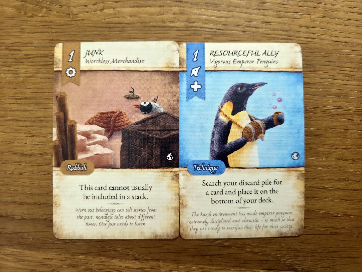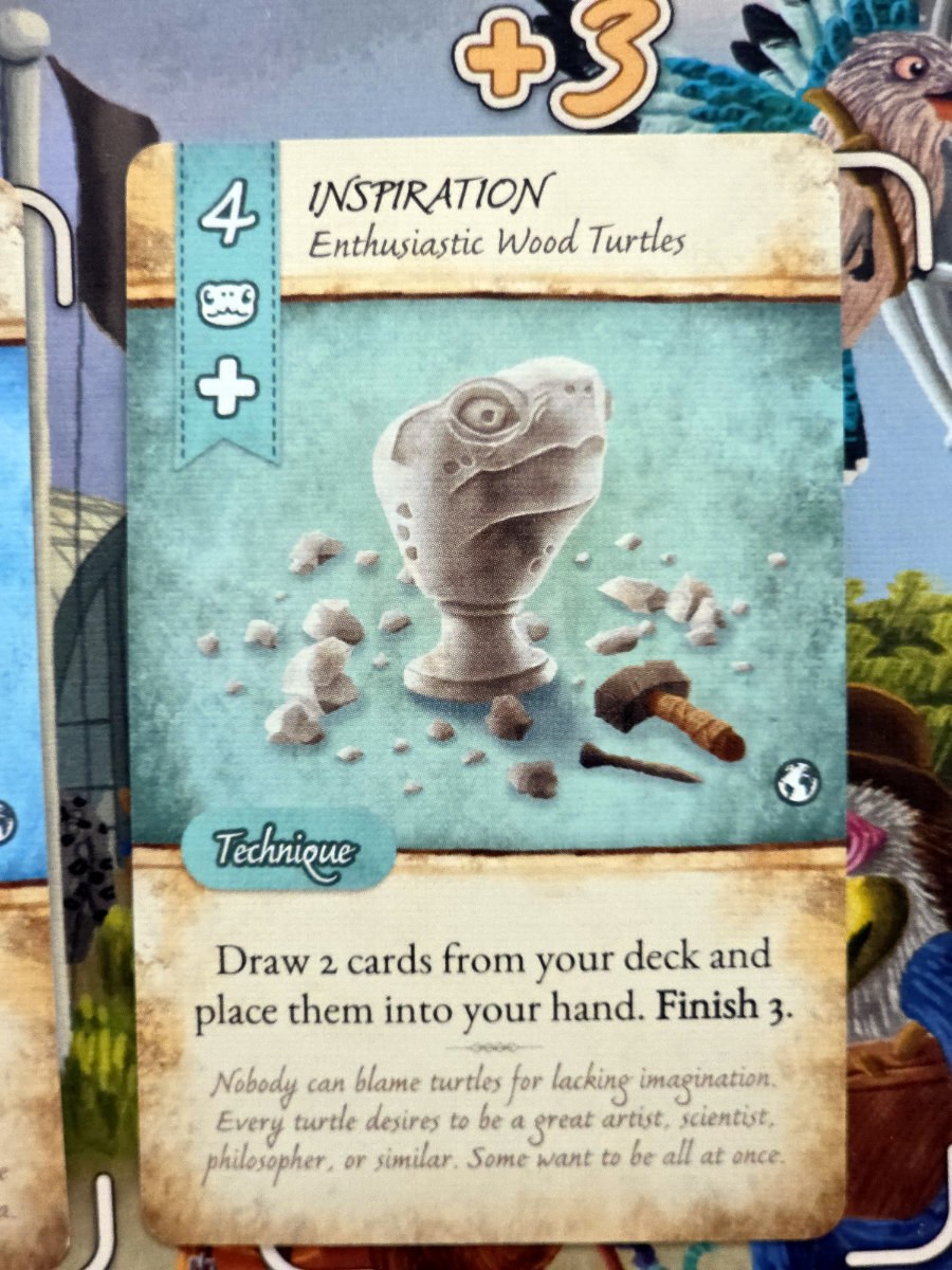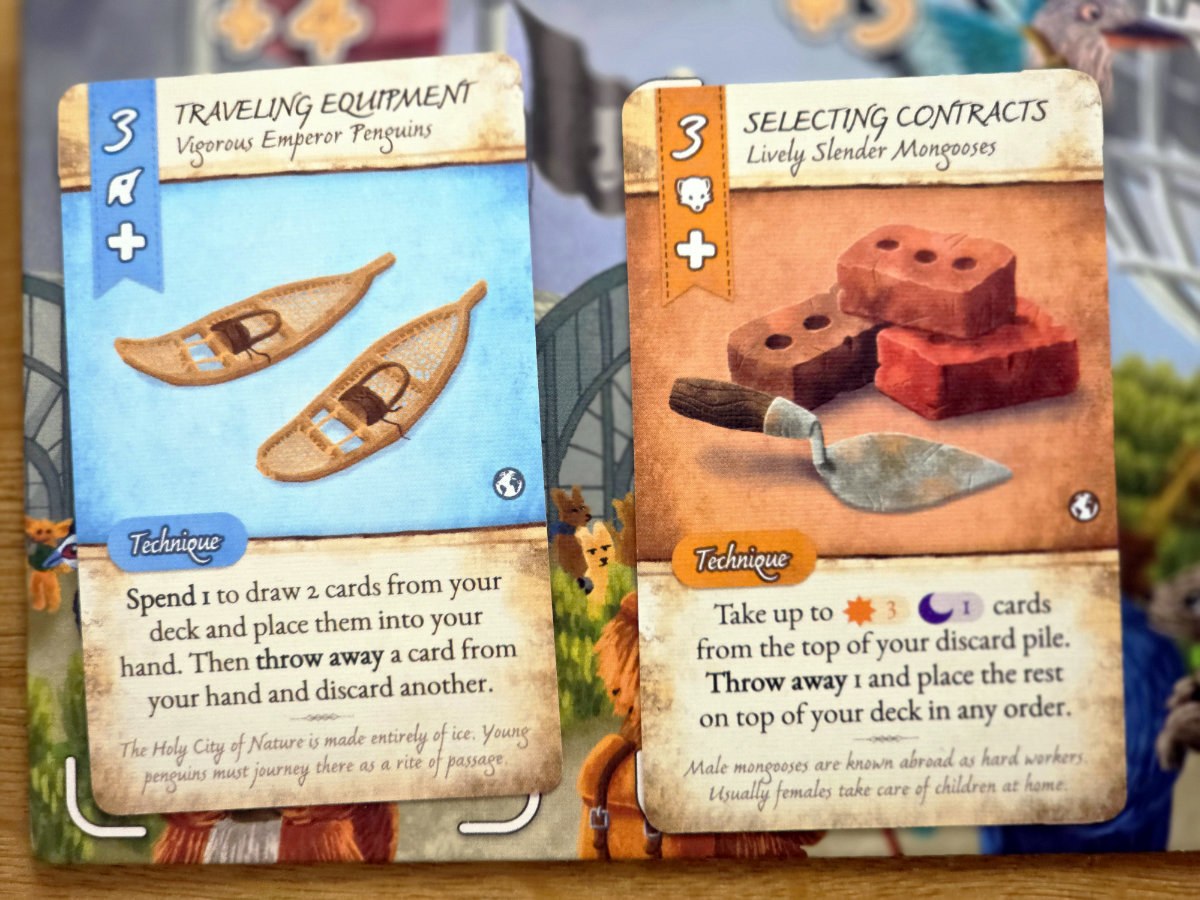 Die „Technikaktion“ erlaubt das Ausspielen einer Technikkarte und ihren Effekt zu nutzen – oft mit Bonusaktionen, die Kettenzüge ermöglichen. Bei der „Stallaktion“ kombiniert man Karten eines Tierdecks so, dass sie exakt den Wert des nächsten Stapels ergeben. Und mit der „Inventaraktion“ kann man beliebig viele Karten abwerfen, um die Hand zu optimieren.