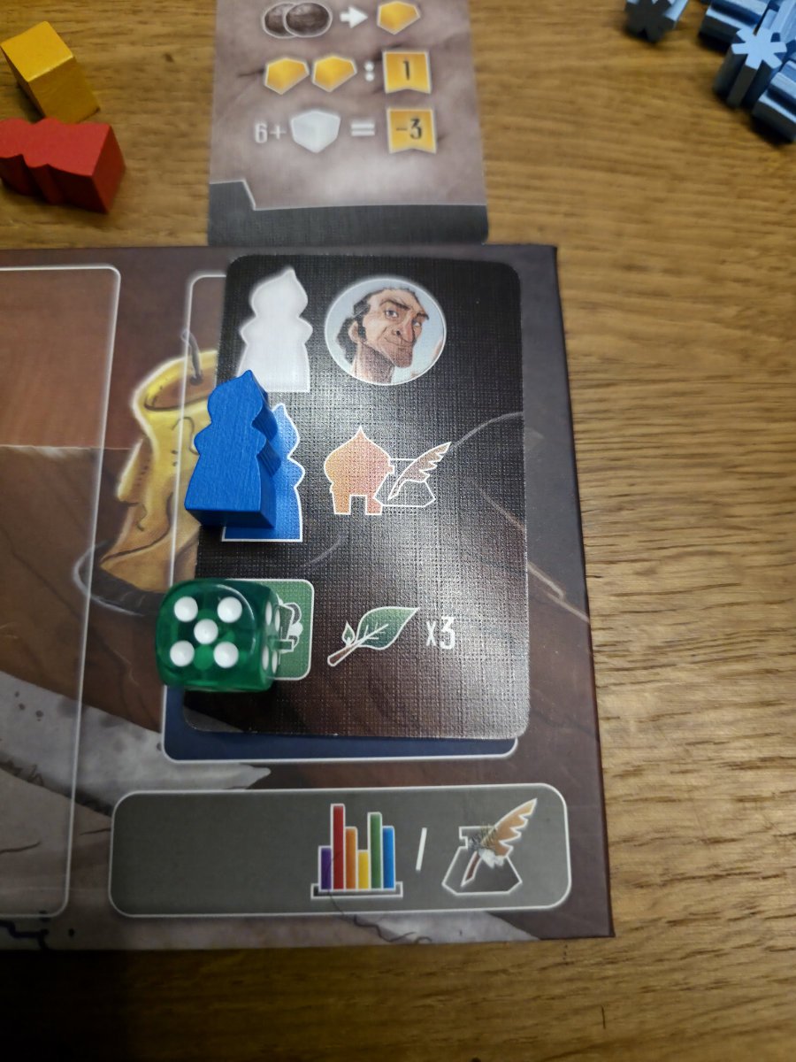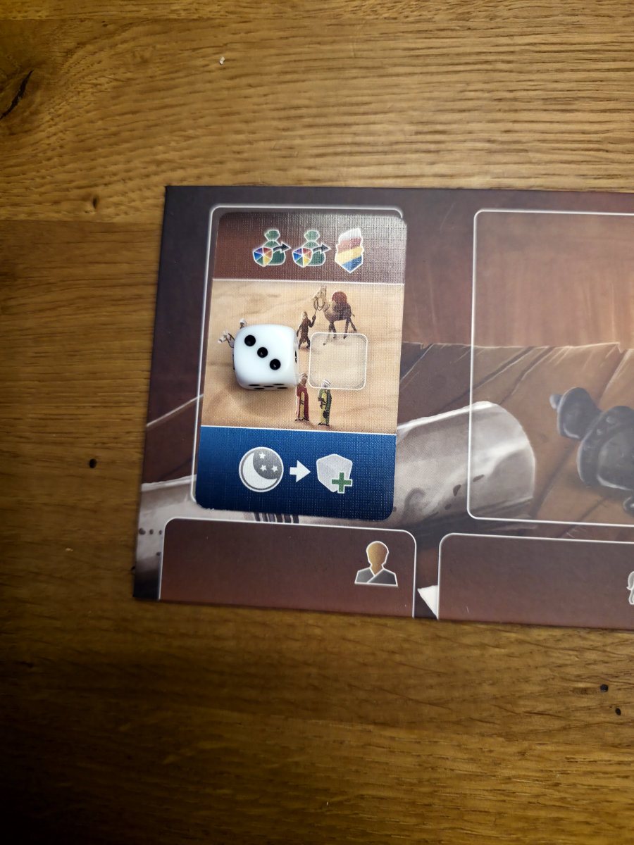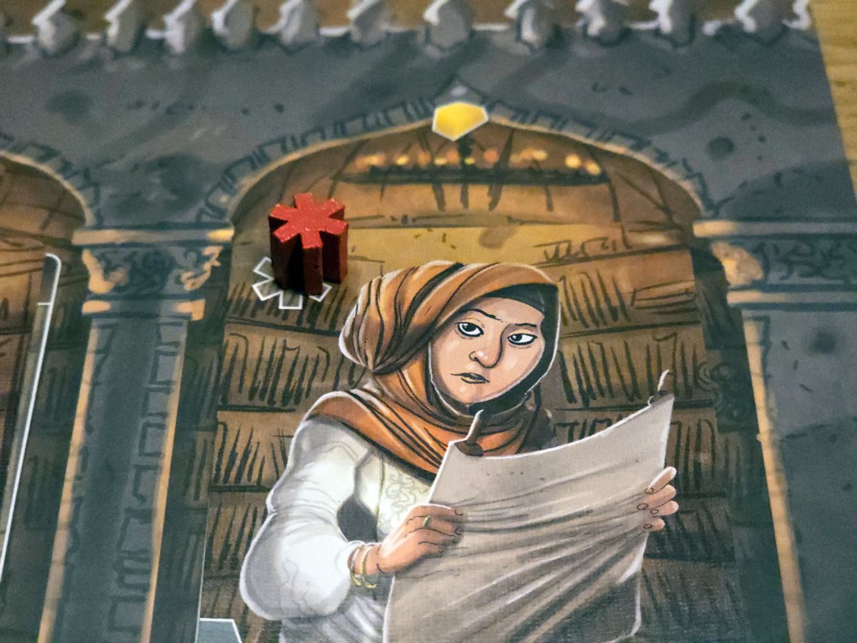 Der eigentliche Kernmechanismus ist jedoch das Übersetzen. Hier zeigt das Spiel seine ganze Brillanz. Man muss eine Kette von Übersetzern bilden, die die Sprache der Schriftrolle Schritt für Schritt bis ins Arabische übertragen. Jede Sprache besitzt eine Stufe, manche Übersetzer überspringen Stufen oder sprechen mehrere Sprachen, und für jeden genutzten Übersetzer zahlt man Gold und gegebenenfalls Silber an Mitspieler. Dieses Puzzle ist jedes Mal anders und unglaublich befriedigend, wenn man eine perfekte Kette legt. Beim Ruhen erhält man Einkommen aus Forschung, zieht neue Würfel und bekommt seine Aktionskarten zurück – ein Moment, der entscheidend für das Timing ist, denn zu früh zu ruhen kostet Tempo, zu spät zu ruhen blockiert Optionen. Ein weiteres stilles, aber mächtiges Element ist das „Pensionieren“ der Übersetzer. Sobald ein Übersetzer genug Gold gesammelt hat, geht er in Rente und wird unter eine der eigenen Aktionsleisten geschoben, wo er dauerhaft die Aktionen verbessert. Doch jede weitere Rente unter derselben Leiste kostet Silber oder bringt zusätzliche weiße Würfel (blähen die eigene Würfelsammlung auf und blockieren damit bessere Möglichkeiten mit farbigen Würfeln), was erneut zu spannenden Abwägungen führt.