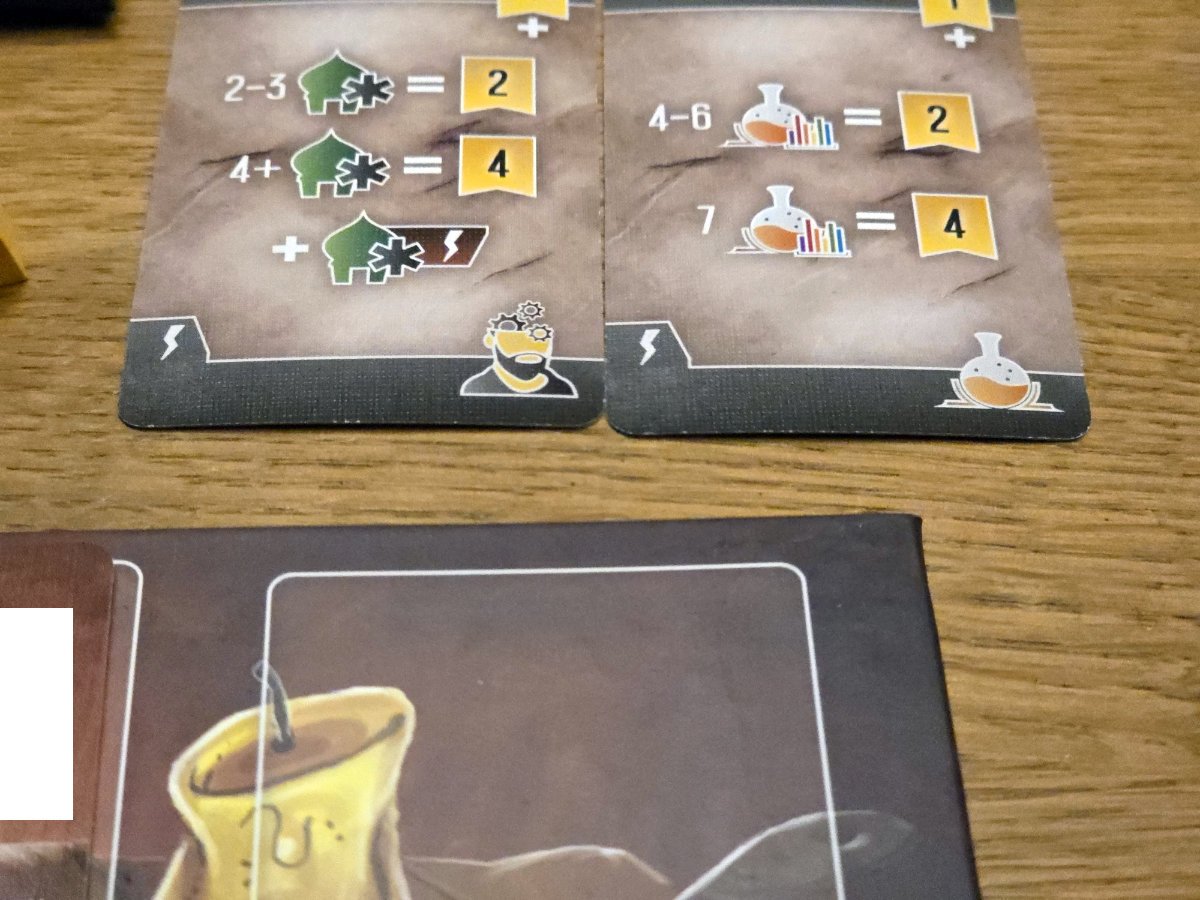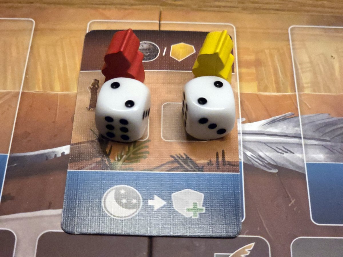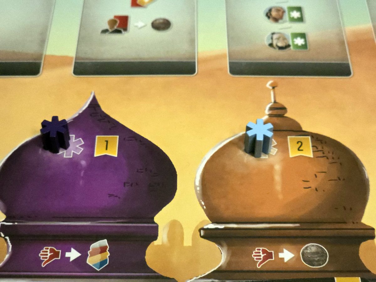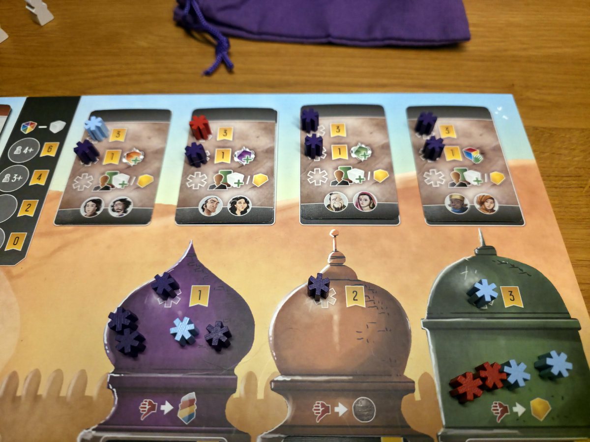 Der eigentliche Kernmechanismus ist jedoch das Übersetzen. Hier zeigt das Spiel seine ganze Brillanz. Man muss eine Kette von Übersetzern bilden, die die Sprache der Schriftrolle Schritt für Schritt bis ins Arabische übertragen. Jede Sprache besitzt eine Stufe, manche Übersetzer überspringen Stufen oder sprechen mehrere Sprachen, und für jeden genutzten Übersetzer zahlt man Gold und gegebenenfalls Silber an Mitspieler. Dieses Puzzle ist jedes Mal anders und unglaublich befriedigend, wenn man eine perfekte Kette legt. Beim Ruhen erhält man Einkommen aus Forschung, zieht neue Würfel und bekommt seine Aktionskarten zurück – ein Moment, der entscheidend für das Timing ist, denn zu früh zu ruhen kostet Tempo, zu spät zu ruhen blockiert Optionen. Ein weiteres stilles, aber mächtiges Element ist das „Pensionieren“ der Übersetzer. Sobald ein Übersetzer genug Gold gesammelt hat, geht er in Rente und wird unter eine der eigenen Aktionsleisten geschoben, wo er dauerhaft die Aktionen verbessert. Doch jede weitere Rente unter derselben Leiste kostet Silber oder bringt zusätzliche weiße Würfel (blähen die eigene Würfelsammlung auf und blockieren damit bessere Möglichkeiten mit farbigen Würfeln), was erneut zu spannenden Abwägungen führt.