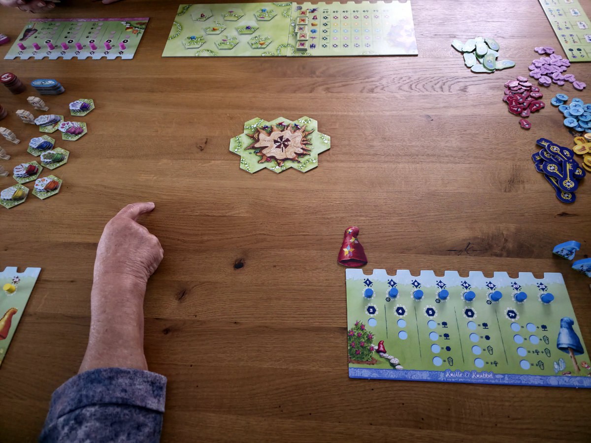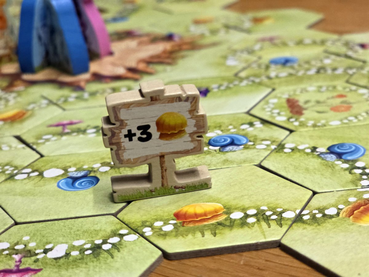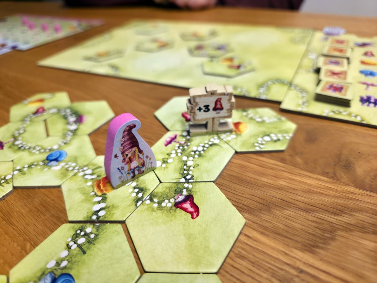 Nach dem Legen und Auflösen der Effekte darf man optional einen der beiden eigenen Gnome bewegen. Das ist der Aktionsmotor. So kann mamn kann einen Weg reservieren, am Blumenmarkt einen neuen Blumentopf für die Sammlung holen (jede neue Farbe erhöht die Punkte bei der Endwertung), ein Schild nutzen oder am zentralen Baumstumpf Pilze verkaufen. Der Pilzmarkt ist dabei ein kleines Wettrennen. Je mehr Verkaufsfelder blockiert werden, desto weniger lukrativ wird der Handel – also lieber früh und oft verkaufen, bevor die guten Plätze weg sind.