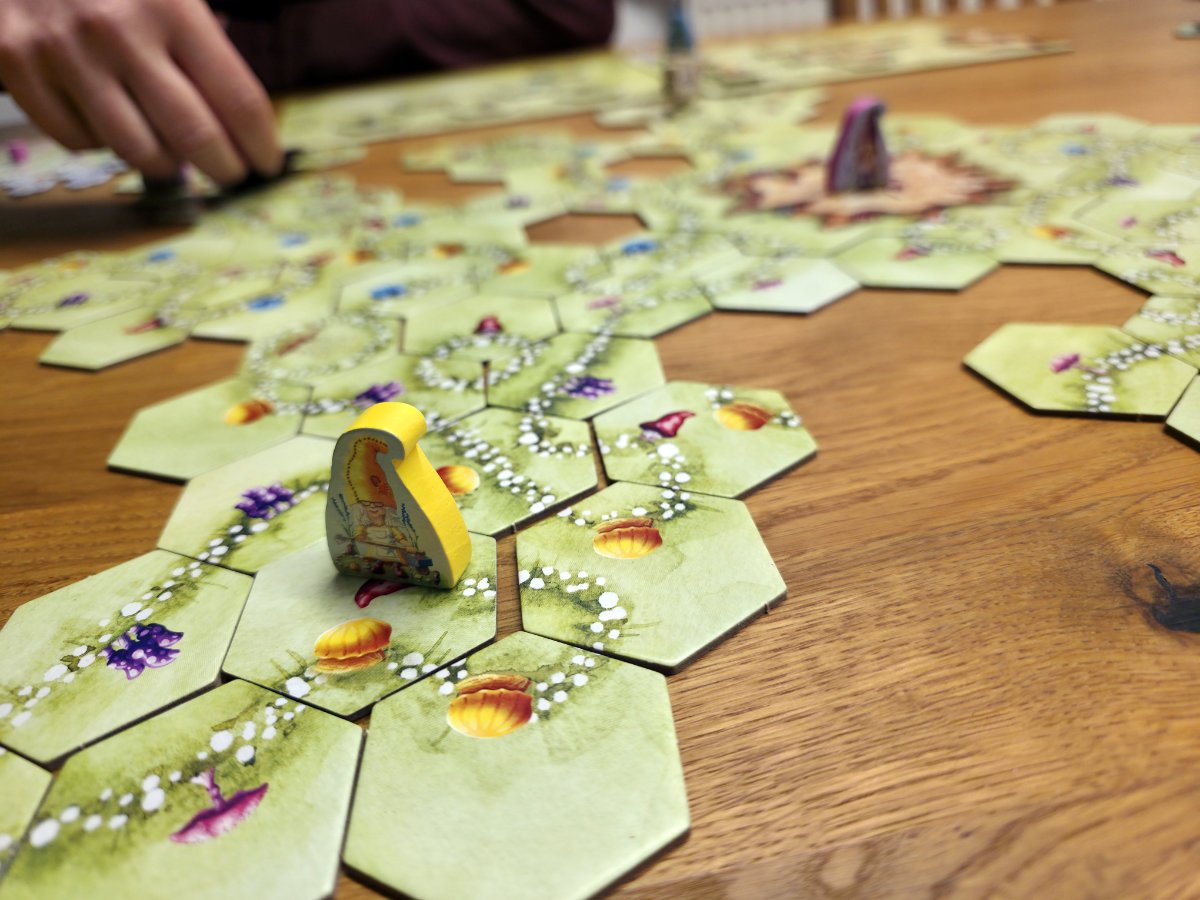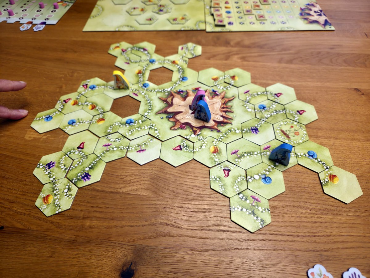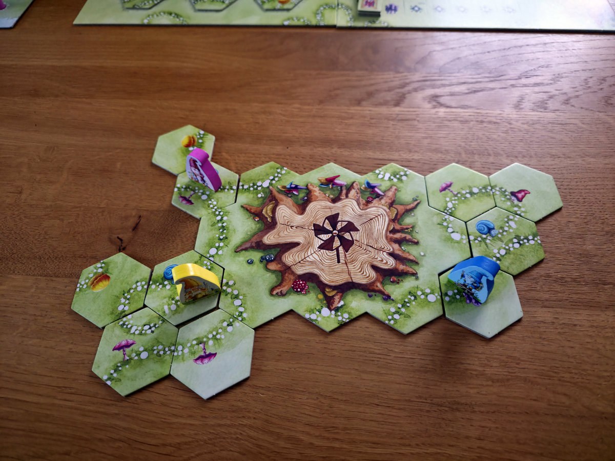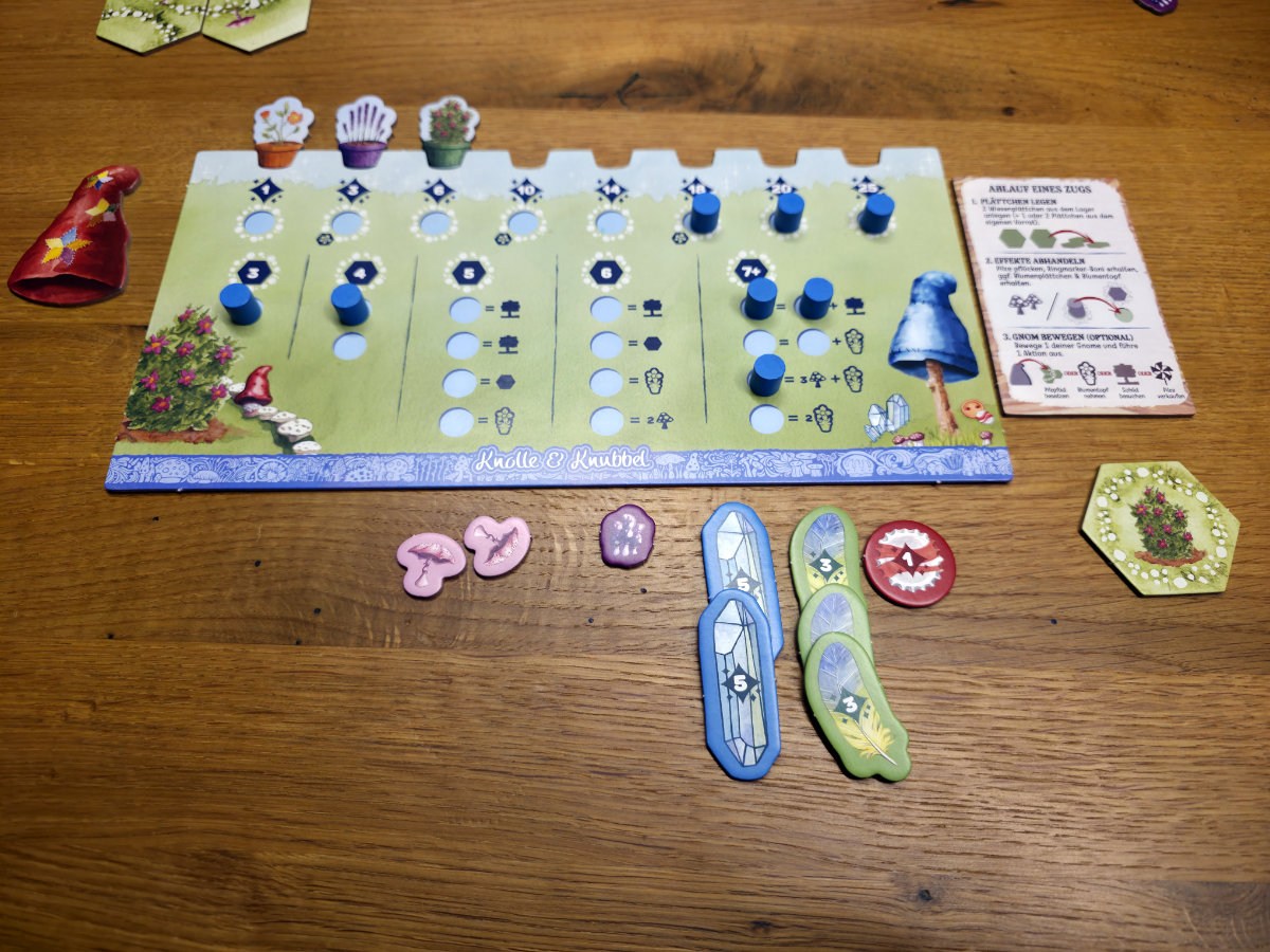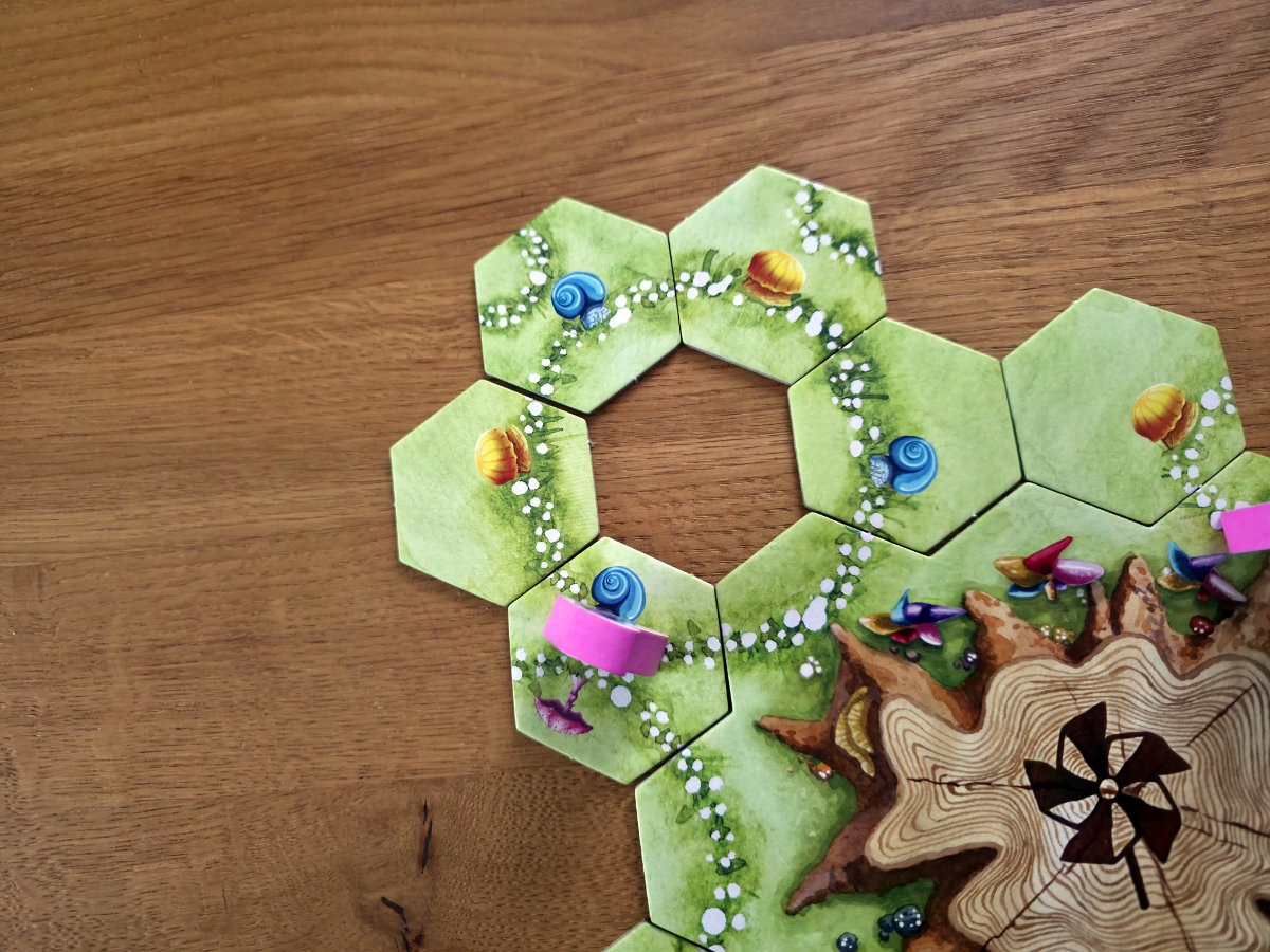 Im Kern baut man im Tal ein immer weiter wachsendes Gartenmosaik aus Plättchen, die kleine weiße Pilzpfade zeigen. Diese Pfade versucht man zu geschlossenen Ringen zu verbinden – denn sobald ein Ring (im weitesten Sinne^^) entsteht, sprießen farbige, magische Pilze aus dem Boden, die dann eingesammelt werden. Klingt simpel, aber der Clou liegt im Timing. Man wählt pro Zug zwei Plättchen aus der Auslage, muss sie passend anlegen, darf dabei keine offenen Wege zweier Gnome miteinander verbinden und hofft, dass einem niemand in die Quere kommt. Oder noch schlimmer, dass jemand den fast fertigen Ring vollendet und damit die Punkte abgreift. Denn wer einen Weg mit seinem Gnom reserviert hat, kontrolliert den Ring – und alle anderen müssen höflich fragen, ob sie überhaupt anlegen dürfen – „kassieren“ wird für den betroffenen Ring aber immer der Erstbesetzer. Gnome sind klein, aber ihre Besitzansprüche sind groß.