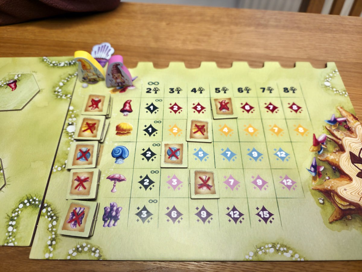 Das Spiel endet, wenn jemand acht Blumen gesammelt hat, acht Ringe gewertet wurden oder die Plättchen ausgehen. Dann gibt es Punkte für Blumen, Ringe und Schätze – Pilze sind am Ende wertlos.