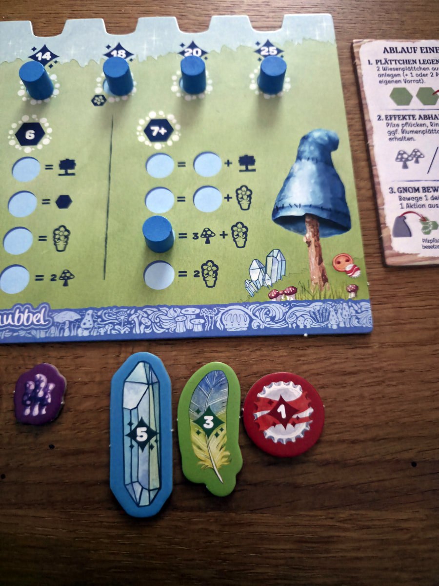 Sobald ein Ring geschlossen ist, wird’s belohnend. Man sammelt die Pilze ein, verschiebt einen der Ringmarker auf dem eigenen Tableau und kassiert Boni – zusätzliche Pilze, Blumen, gespeicherte Plättchen oder sogar Schilder, die man in den Garten setzt. Diese kann man später mit einem Gnom besuchen, um weitere Vorteile zu erhalten. Und genau hier beginnt das Spiel zu „kaskadieren“. Ein Ring löst einen Bonus aus, der ein Wildblumenplättchen (ein Plättchen mit einem fertig geschlossenem Ring) gibt, das wiederum sofort einen neuen Ring schließen kann, der wieder einen Bonus triggert und plötzlich fühlt man sich wie ein gnomischer Mastermind, der das Pilzuniversum kontrolliert.