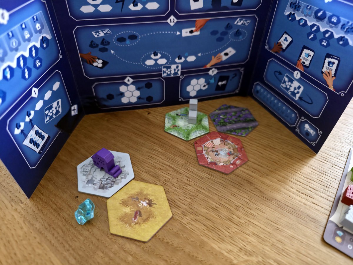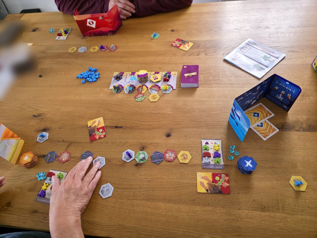 Der Ablauf einer Partie folgt einem klar strukturierten Rhythmus aus vier Phasen, die sich über vier Runden wiederholen. Zunächst werden Landschaften entdeckt, also aufgedeckt und hinter dem eigenen Sichtschirm gesammelt – ein jeder hat 20 Plättchen zur Verfügung. Anschließend folgt die zentrale Phase des Spiels, das Teilen. Jeder Spieler teilt seine fünf Landschaften geheim in zwei Gruppen auf, wobei die Verteilung frei gewählt werden darf, solange sie eine der Kombinationen 2:3, 1:4 oder 0:5 erfüllt. Die kleinere Gruppe erhält zusätzlich einen Kristall, der am Spielende Punkte bringt. Dieser Mechanismus ist das Herzstück des Spiels, denn er zwingt zu einer ständigen Abwägung zwischen Attraktivität und Risiko. Eine zu starke Gruppe lockt den Nachbarn an, eine zu schwache verschenkt Potenzial. Gleichzeitig muss man bedenken, dass man selbst am Ende beide Gruppen eines Nachbarn erhält – eine Entscheidung, die man nicht direkt beeinflussen kann, aber durch geschicktes Teilen zumindest indirekt steuert. Die Mitspieler zu beobachten ist hier essentiell, denn man kann ein noch so toll gemeintes Angebot aufstellen, um ein vermeintlich unattraktiveres selbst behalten zu können, aber wenn der andere einem bestimmten Ziel hinterher plant, wird er doch auch mal gerne das kleinere Angebot wählen.
