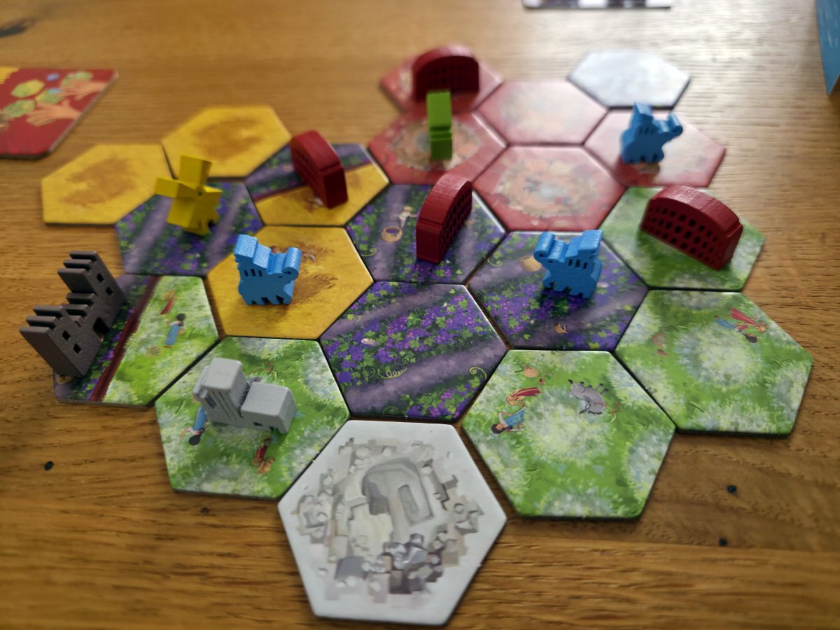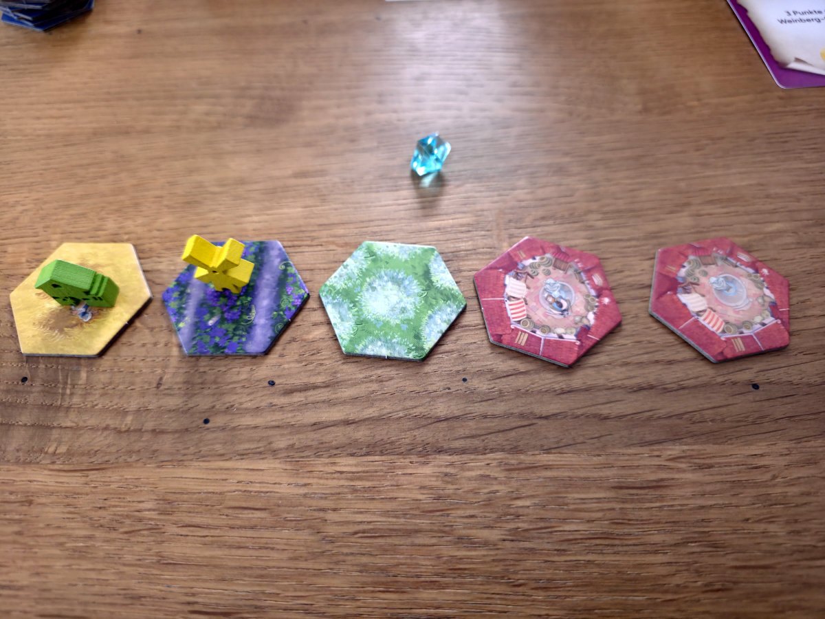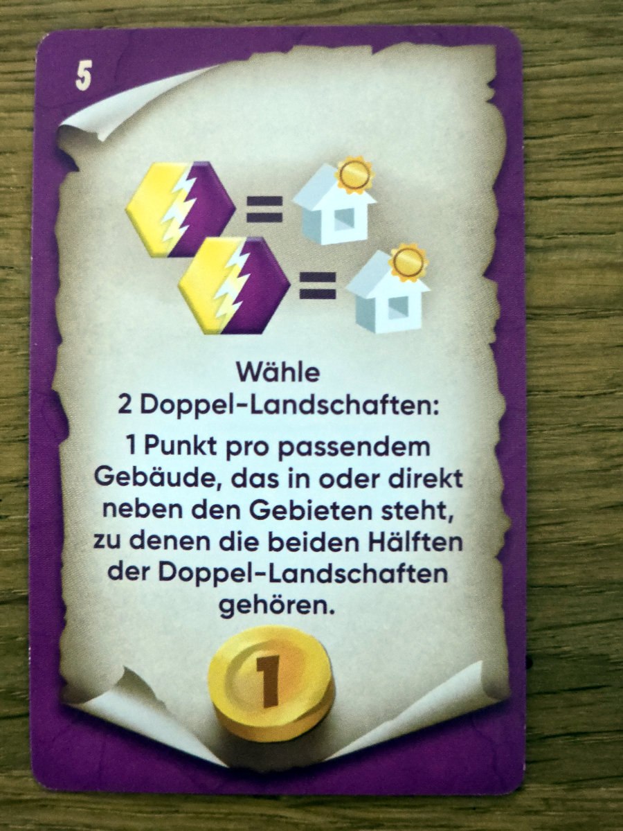 In der vierten Phase werden die erhaltenen Landschaften an das eigene Reich angebaut. Dabei müssen alle Kanten an bereits bestehende Landschaften angrenzen und einmal gelegte Plättchen dürfen nicht mehr verschoben werden. Dieser Puzzleteil des Spiels ist erstaunlich befriedigend, denn er verbindet räumliches Denken mit langfristiger Planung. Gebäude bringen am Ende Punkte, wenn sie auf oder direkt neben einem zusammenhängenden Gebiet der passenden Landschaftsfarbe stehen! Wer also ein violettes Gebäude besitzt, möchte ein möglichst großes violettes Gebiet darum herum aufbauen. Gleichzeitig konkurrieren die Landschaften untereinander um Platz, und oft muss man sich entscheiden, ob man ein Gebiet optimiert oder ein anderes opfert. Die Kristalle, die man durch geschicktes Teilen erhält, bieten eine kleine, aber feine Zusatzwertung, die manchmal über Sieg oder Niederlage entscheiden kann.