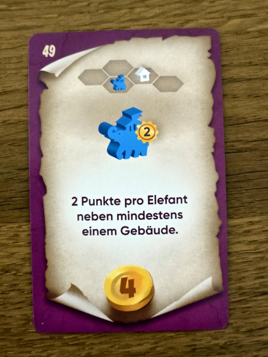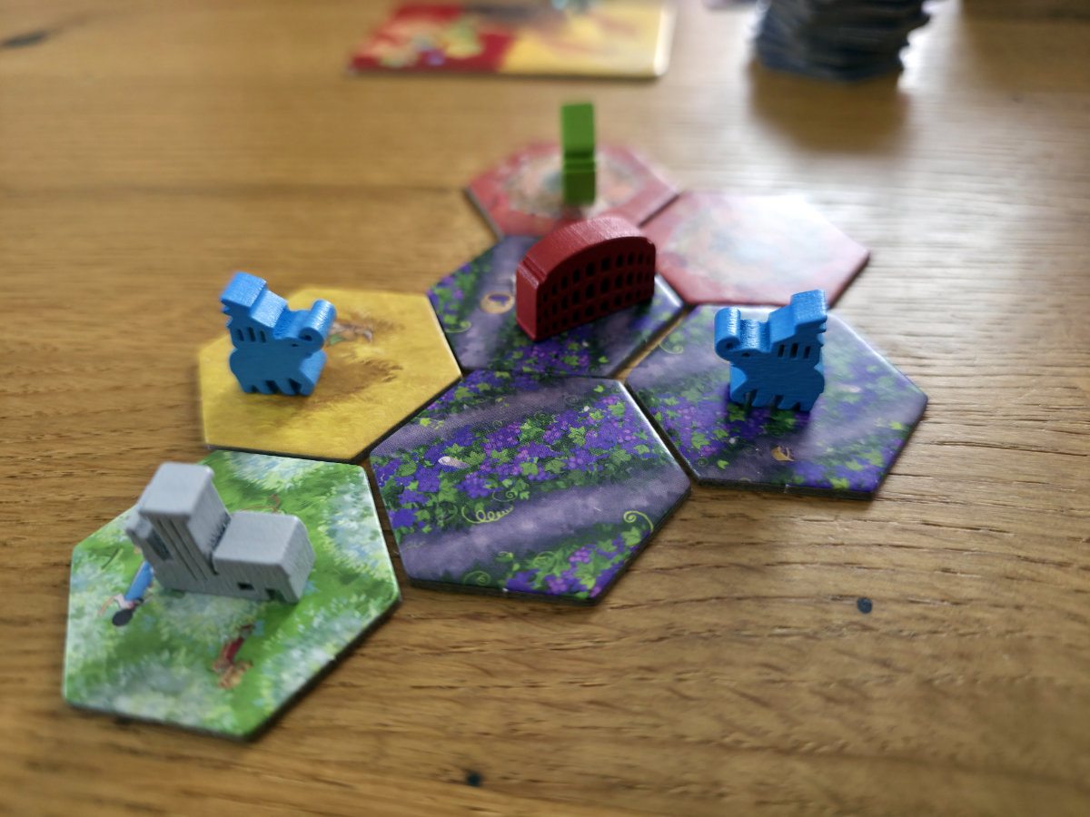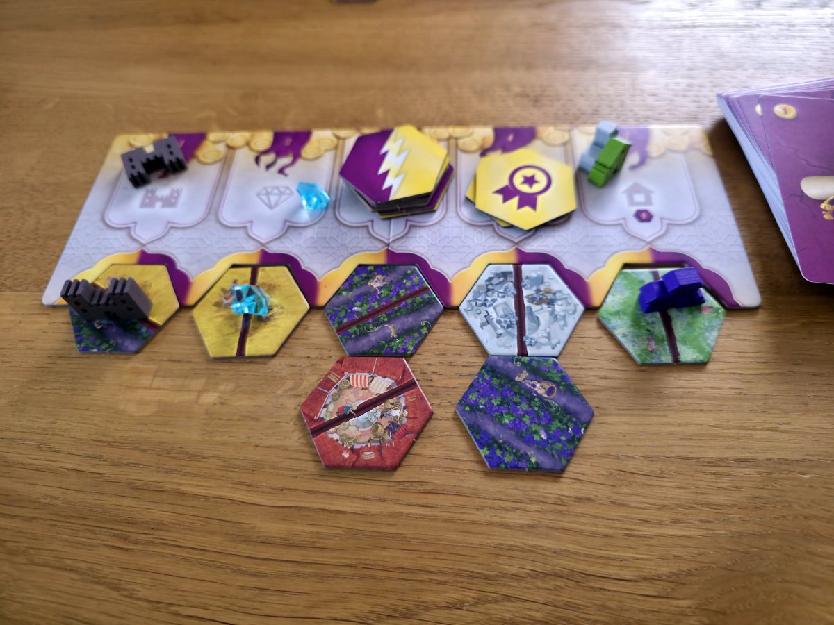 In der vierten Phase werden die erhaltenen Landschaften an das eigene Reich angebaut. Dabei müssen alle Kanten an bereits bestehende Landschaften angrenzen und einmal gelegte Plättchen dürfen nicht mehr verschoben werden. Dieser Puzzleteil des Spiels ist erstaunlich befriedigend, denn er verbindet räumliches Denken mit langfristiger Planung. Gebäude bringen am Ende Punkte, wenn sie auf oder direkt neben einem zusammenhängenden Gebiet der passenden Landschaftsfarbe stehen! Wer also ein violettes Gebäude besitzt, möchte ein möglichst großes violettes Gebiet darum herum aufbauen. Gleichzeitig konkurrieren die Landschaften untereinander um Platz, und oft muss man sich entscheiden, ob man ein Gebiet optimiert oder ein anderes opfert. Die Kristalle, die man durch geschicktes Teilen erhält, bieten eine kleine, aber feine Zusatzwertung, die manchmal über Sieg oder Niederlage entscheiden kann.
