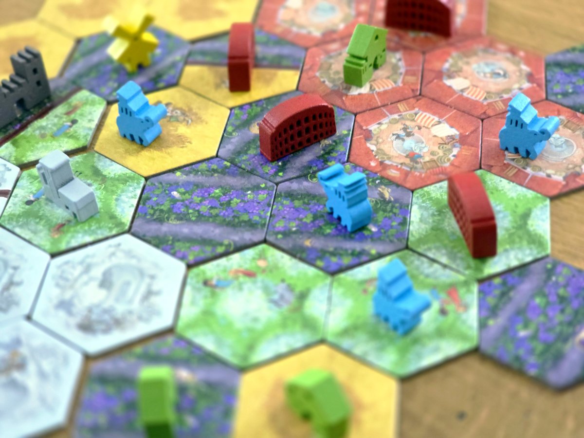 Im Kern baut jeder Spieler über vier Runden hinweg sein eigenes kleines Römisches Reich, indem er Landschaften und darauf platzierte Gebäude geschickt anordnet. Das Material besteht aus einer großen Menge an Landschaftsplättchen, die jeweils eine der typischen Regionen des Imperiums zeigen, sowie aus Gebäuden, die fest mit bestimmten Landschaften verbunden sind. Dieser Punkt ist wichtig, denn Gebäude dürfen niemals von ihren Landschaften getrennt oder später verschoben werden – wenn sie einmal platziert wurden, dies ist insbesondere bei der Wahl der Plättchen wichtig, da hier die Gebäude vorbestimmt platziert wurden. Dadurch entsteht ein reizvoller planerischer Druck. Jede Entscheidung ist endgültig, und jede Platzierung wirkt sich auf die spätere Wertung aus.