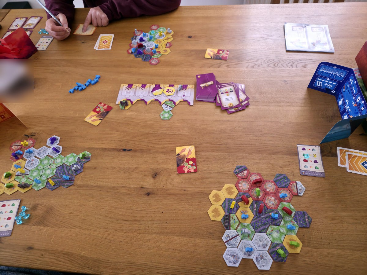 Spielerisch überzeugt „RaeT“ durch seine Mischung aus Einfachheit und Anspruch. Die Regeln sind schnell erklärt, der Ablauf ist intuitiv und dennoch steckt in jeder Entscheidung eine überraschende Tiefe. Das Teilen der Landschaften ist ein ständiges psychologisches Duell, das Wählen sorgt für Spannung und das Anbauen belohnt planerisches Geschick. Besonders gelungen ist, dass das Spiel trotz seines Puzzlecharakters nie solitär wirkt. Die Interaktion über das Teilen und Wählen ist zentral und sorgt dafür, dass man ständig auf die Mitspieler achtet.