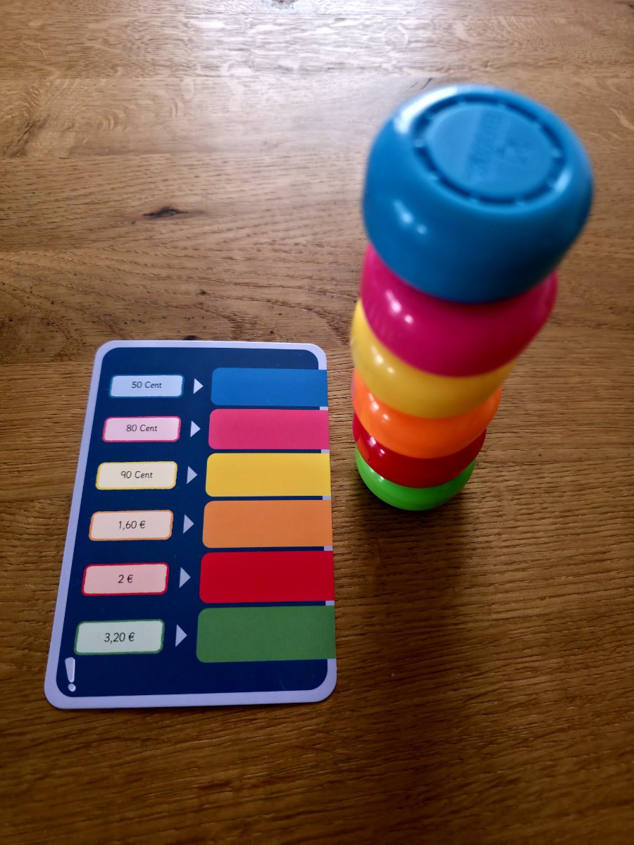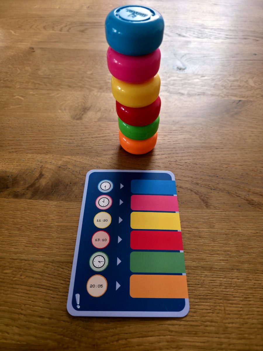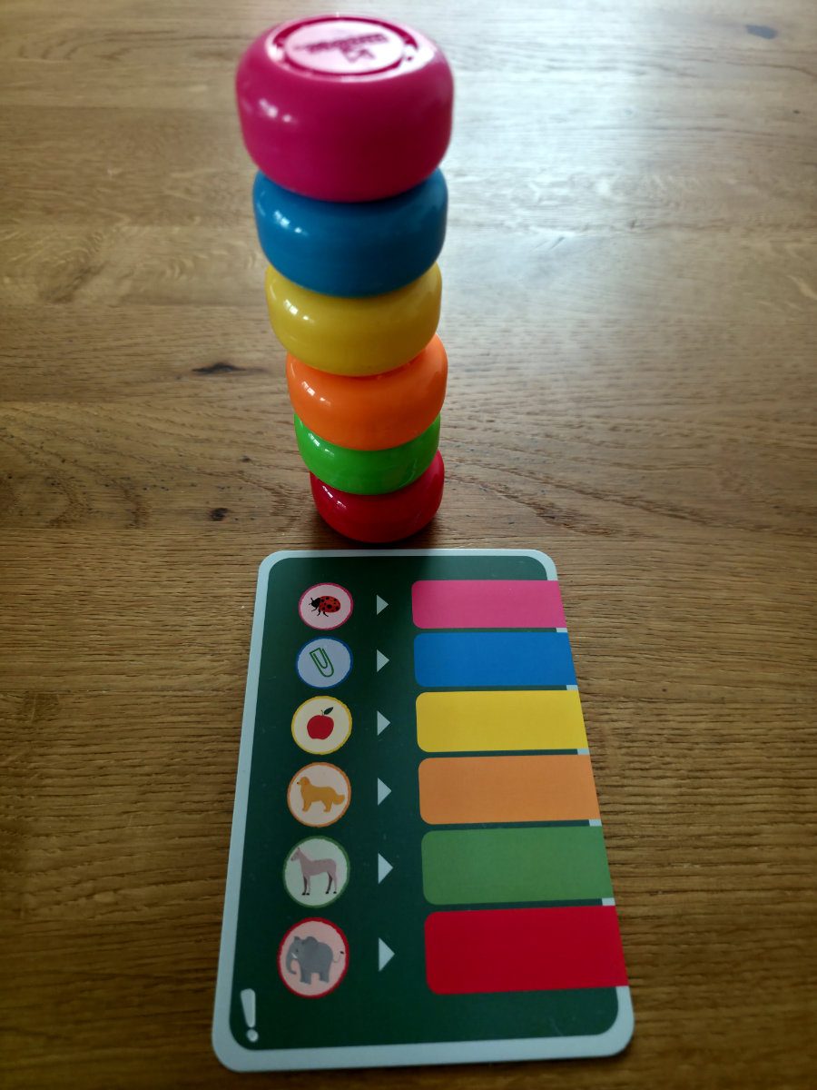 Die Grundidee ist, dass Kinder Aufgaben lösen, indem sie farbige Magnetchips in der richtigen Reihenfolge stapeln. Jede Aufgabenkarte zeigt, was zu tun ist; die Rückseite bietet eine sofortige Selbstkontrolle (hier wird der fertige Stapel gezeigt, so daß sofort die richtige Reihenfolge ersehen werden kann). Das haptische „Klick Klack“ beim Stapeln ist nicht nur charmant, sondern motiviert auch enorm — ein kleines Erfolgserlebnis bei jedem Chip.