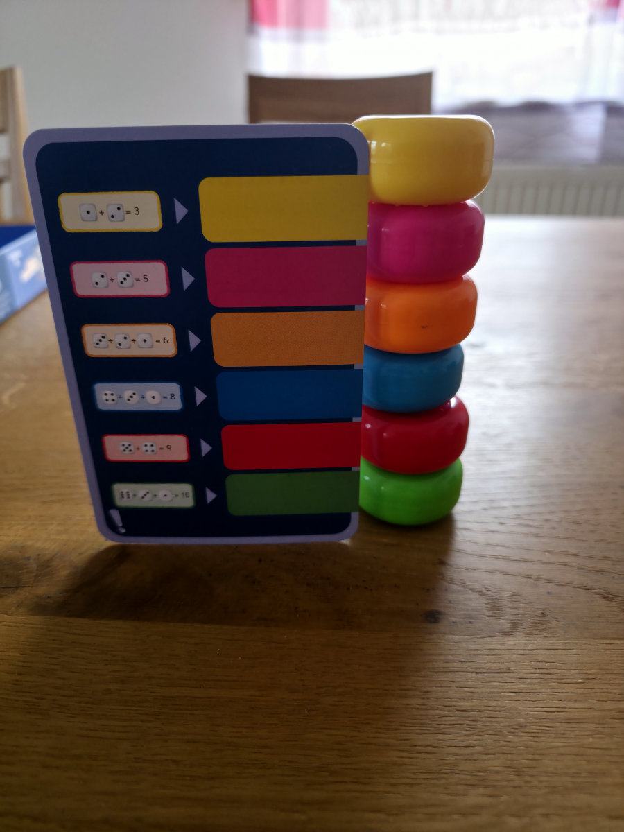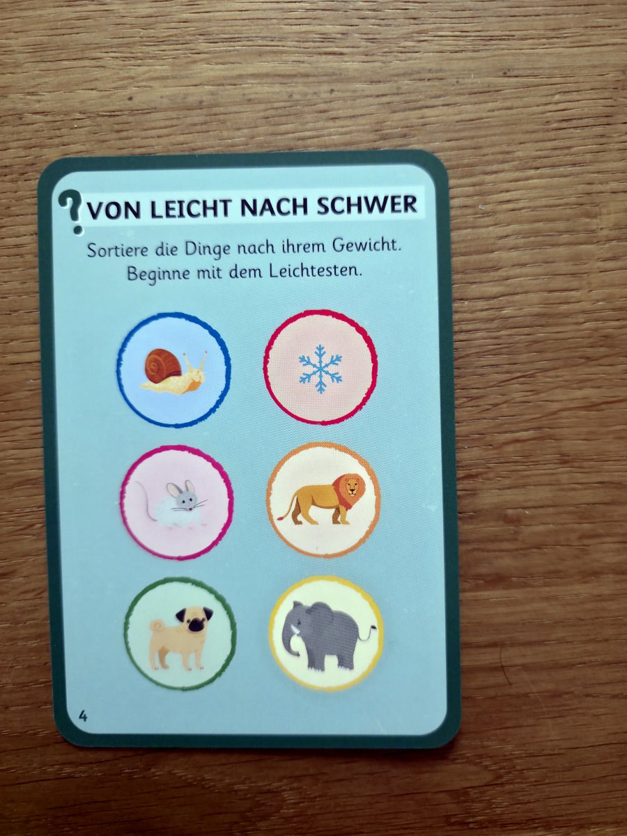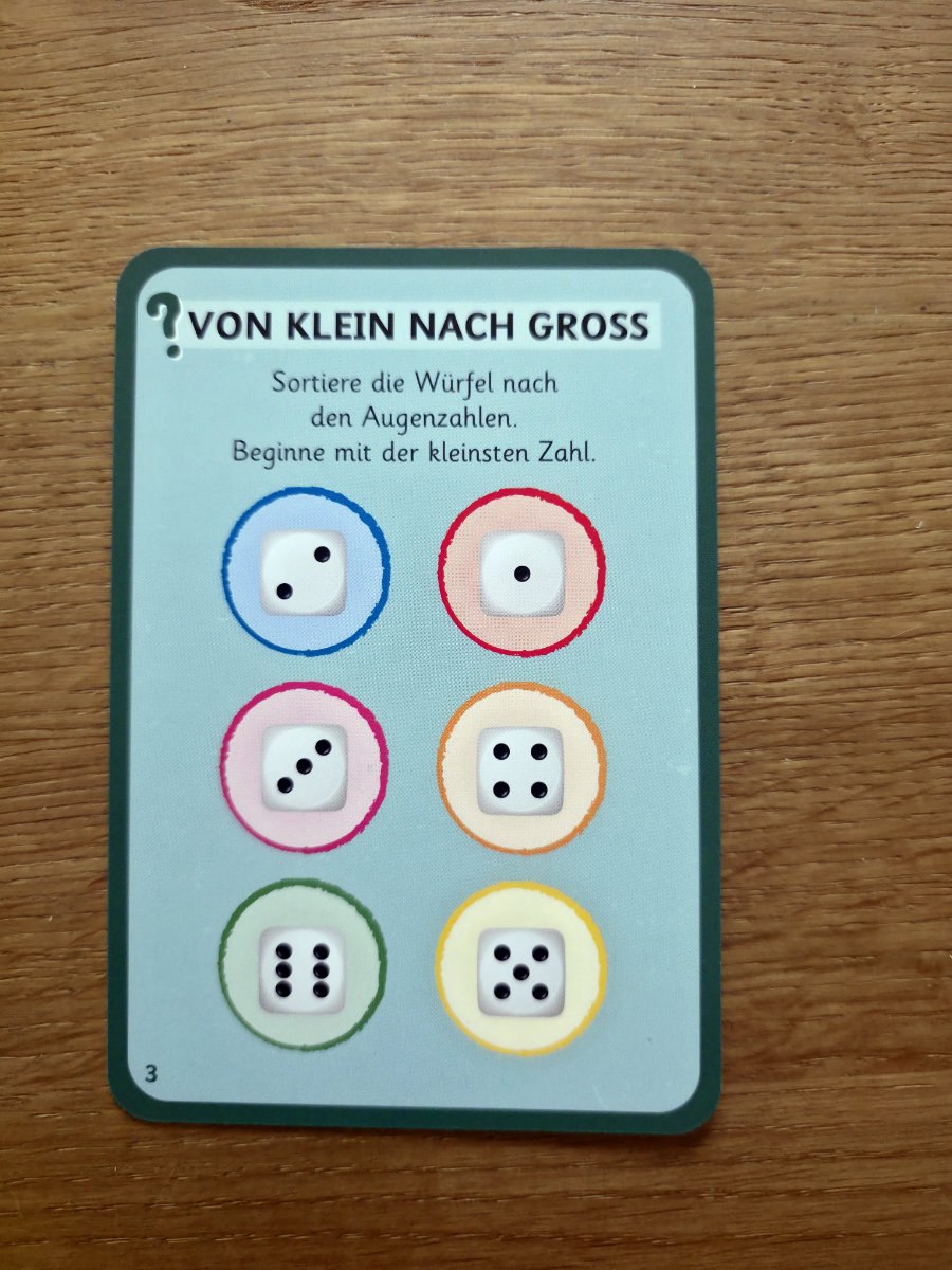 Die Grundidee ist, dass Kinder Aufgaben lösen, indem sie farbige Magnetchips in der richtigen Reihenfolge stapeln. Jede Aufgabenkarte zeigt, was zu tun ist; die Rückseite bietet eine sofortige Selbstkontrolle (hier wird der fertige Stapel gezeigt, so daß sofort die richtige Reihenfolge ersehen werden kann). Das haptische „Klick Klack“ beim Stapeln ist nicht nur charmant, sondern motiviert auch enorm — ein kleines Erfolgserlebnis bei jedem Chip.