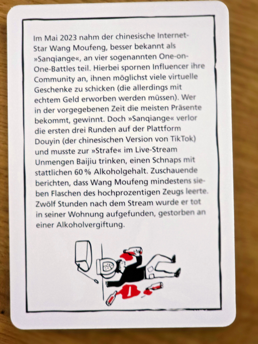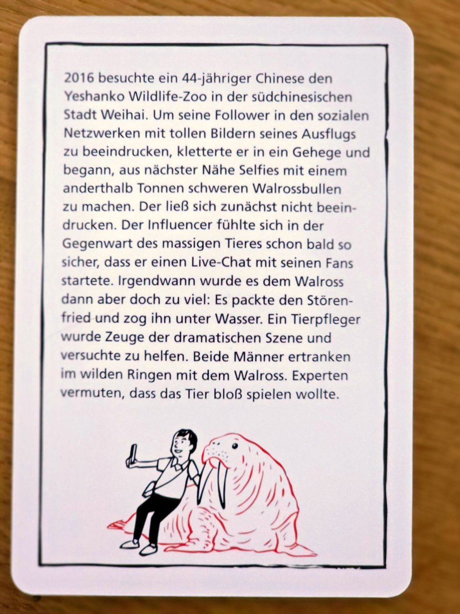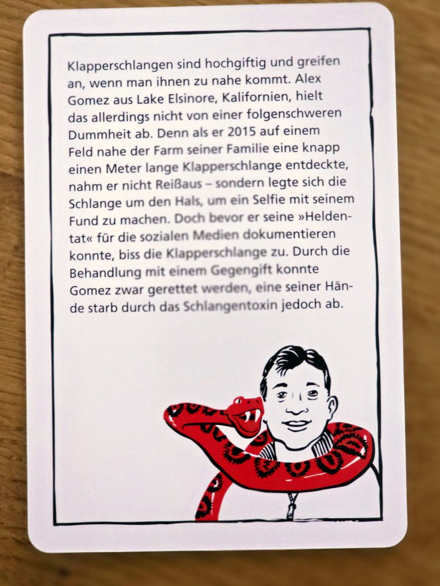 Diese 50 Karten sorgen für reichlich verknobelten Spielspass, der aber natürlich auch von der Spielgruppe abhängt. Bekannt schwarzhumorig sind diese wahren Erlebnisse aber nicht immer wirkliche Logikknaller für nicht-Kriminologen, zu kreativ sind da die nötigen „um die Ecke denken“-Herleitungen. An sich aber dennoch bekannte, rabenschwarze Kost, die den Fans sicherlich gefallen wird.
